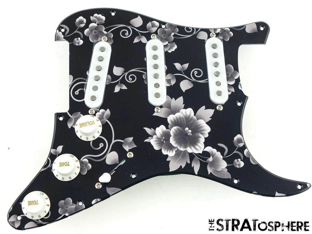 Description: Loaded Pickguard for Stratocaster complete with Alnico 5 Pickups (Output: Neck 6.0K 4.0H, Middle 6.0K 4.0H, Bridge 6.4K 4.5H; Staggered Alnico 5 magnets), 250K Pots, 5 Way Switch and Knobs Condition: New Type: Loaded Pickguard (Black Rose, 11 Hole for Fender American & Mexican Standard) Comments: This great sounding prewired pickguard features just the right amount of output, a tight low end, slightly scooped mids and defined treble. It delivers beautiful clean tones and loves to be pushed into sweet overdrive- maintains great clarity without getting harsh. We have had this line manufactured in great volume in order to provide you the best value on the market for alnico magnet designed pickups. Get yours today!