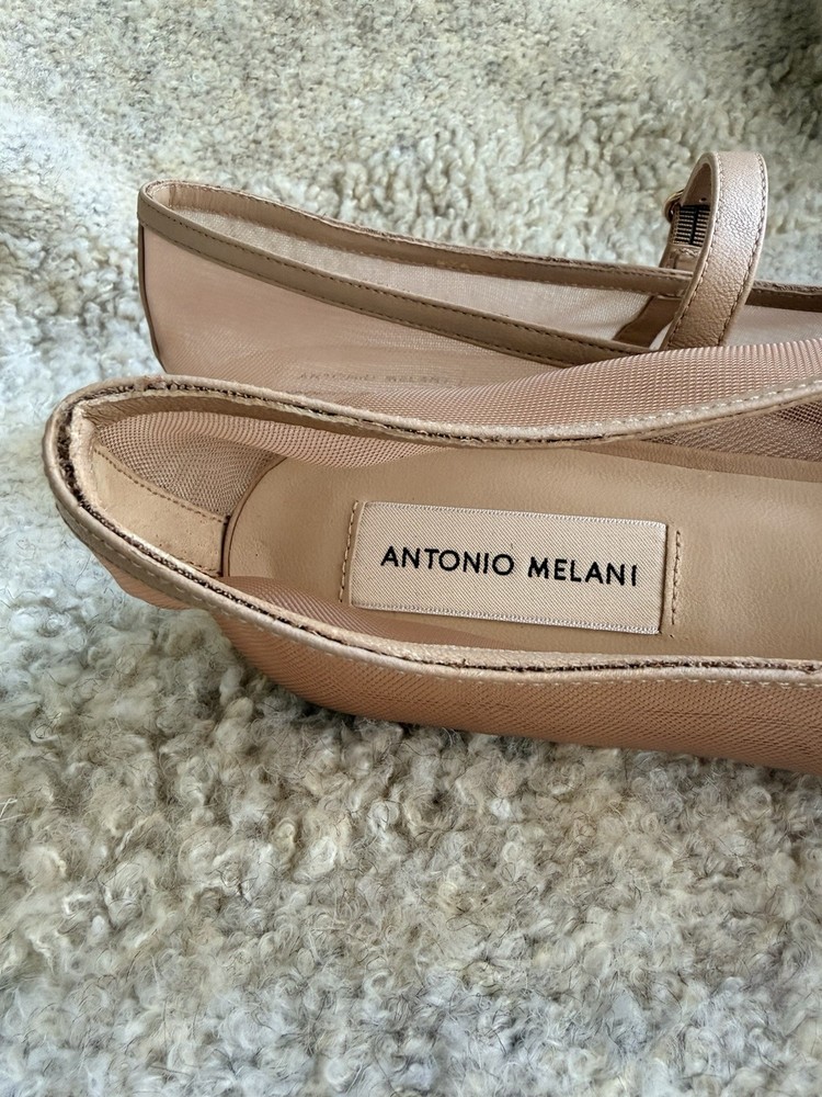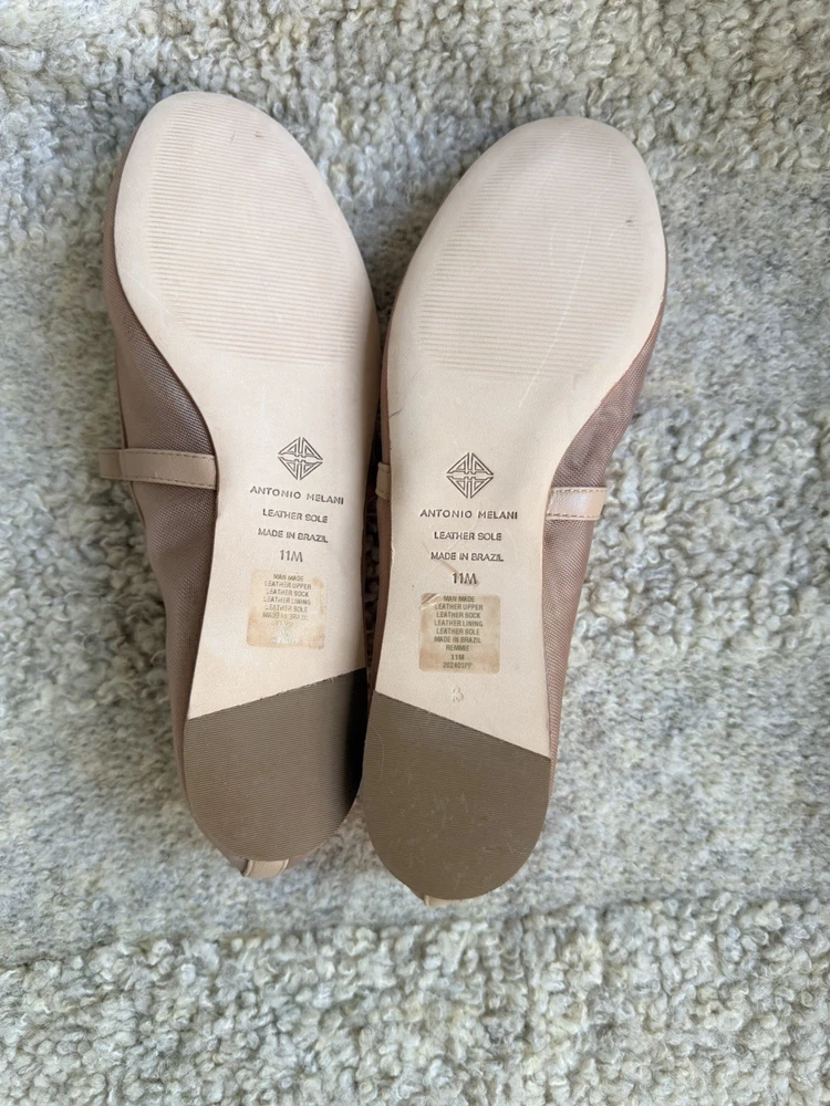 The product is a pair of Antonio Melani Remmie Mesh Mary Jane flats in a tan or beige color, designed for women in a US shoe size 11. Made with mesh fabric and upper material, these flats have a stylish mary jane design that originated from Brazil. Perfect for adding a touch of elegance to any outfit, these stylish flats offer both comfort and fashion-forward style.