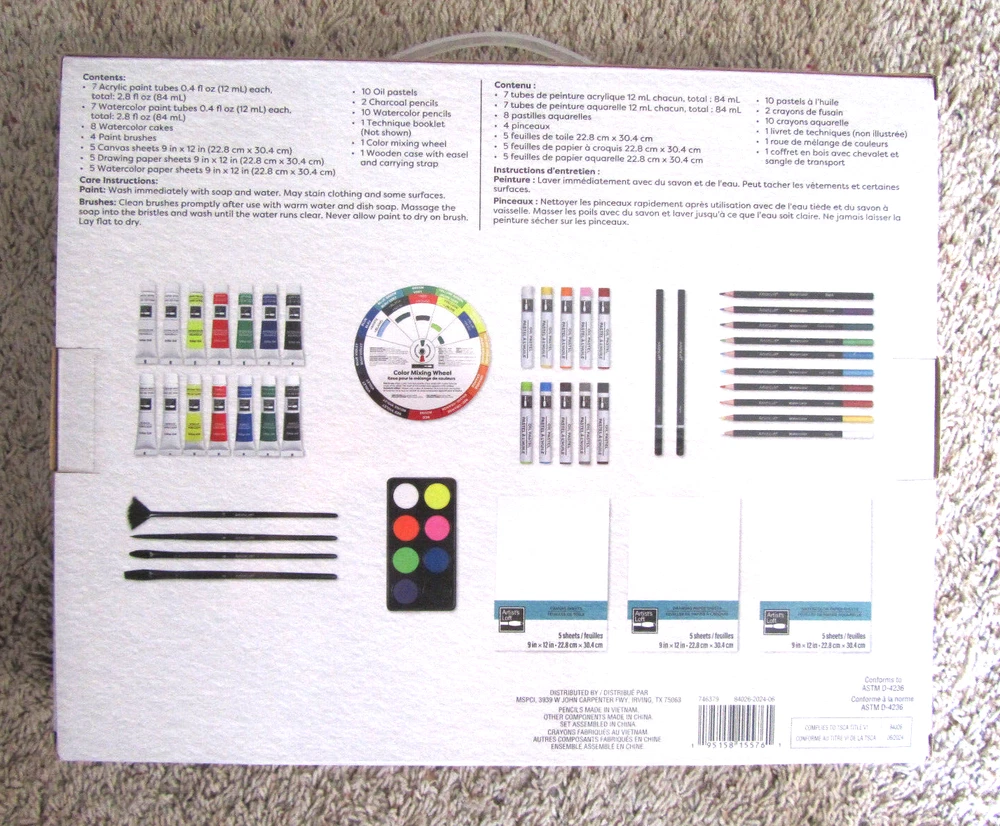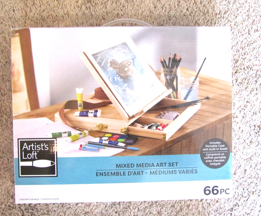 New in Unopened Box! Artist's Loft 66PC Mixed Media Art Set-Great for beginners! Retail $49.99 Details: 66 pieces Includes portable case with built-in easel Conforms to ASTM D-4236 Complies to TSCA Title VI Contents: 10 oil pastels 10 watercolor pencils 8 watercolor cakes 7 acrylic paint tubes (0.4 fl. oz./12 mL) 7 watercolor paint tubes (0.4 fl. oz./12 mL) 5 canvas sheets (9" x 12"/22.8cm x 30.4cm) 5 drawing paper sheets (9" x 12"/22.8cm x 30.4cm) 5 watercolor paper sheets (9" x 12"/22.8cm x 30.4cm) 4 paint brushes 2 charcoal pencils 1 technique booklet 1 color mixing wheel 1 wooden case with easel and carrying strap