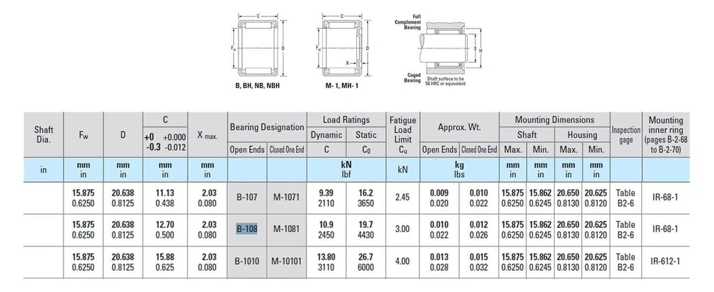 Brand New Bearing Bore Diameter : 5/8" (15.875mm) Outside Diameter : 0.8125" (20.638mm) Overall Width : 0.500" (12.70mm) No Oil Hole B series - standard series full complement of mechanically-retained needle rollers