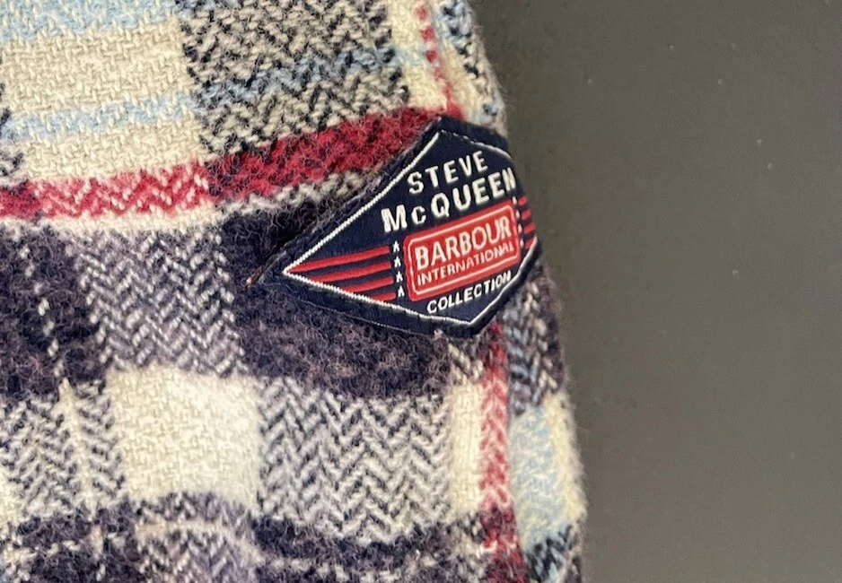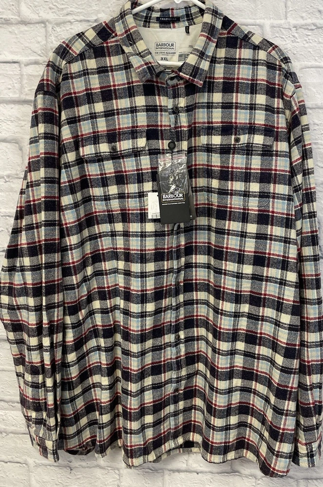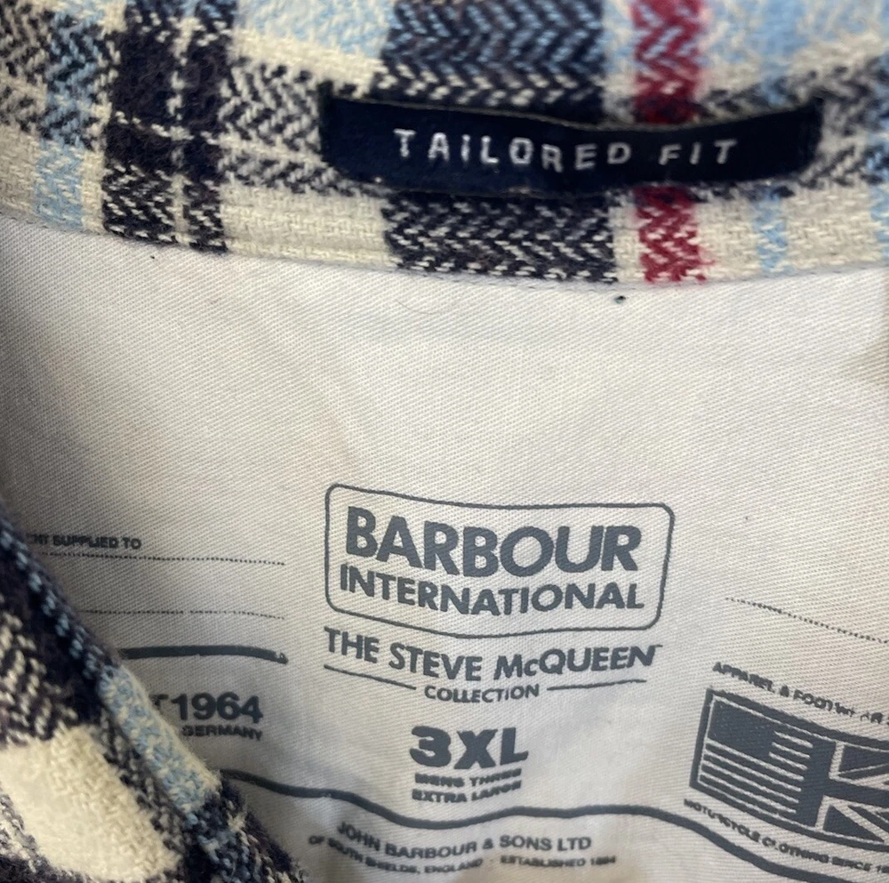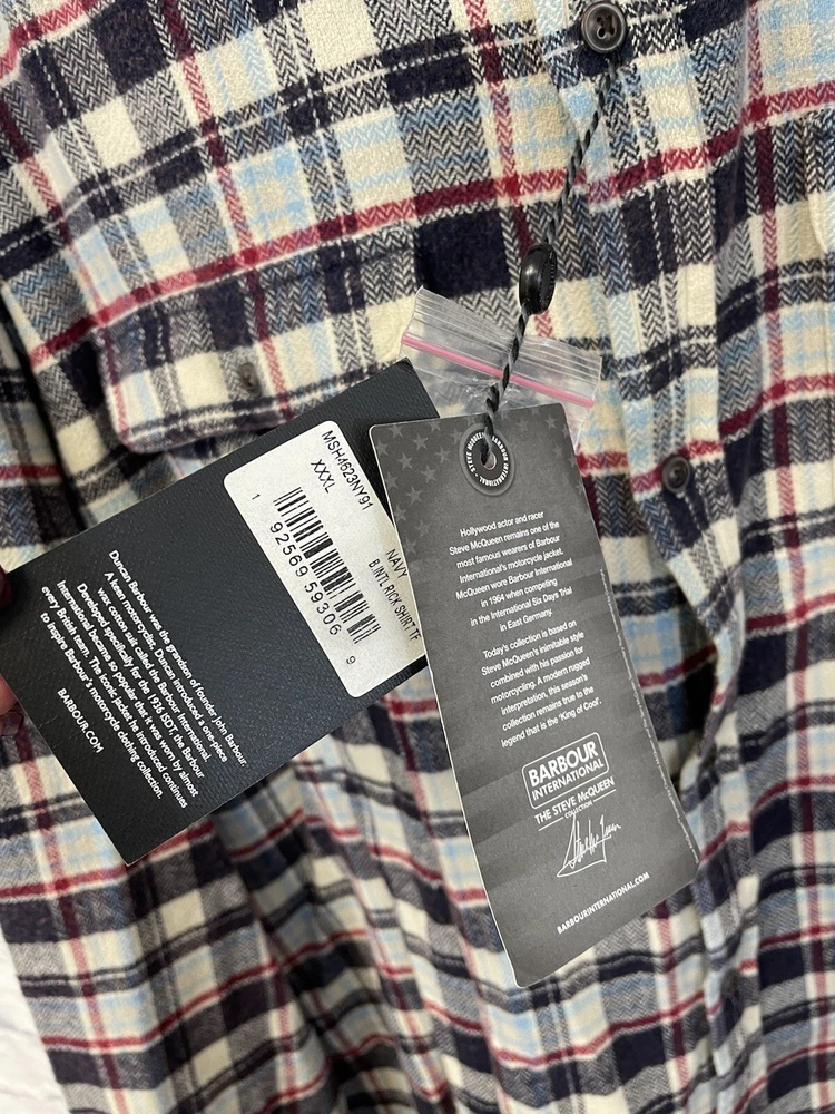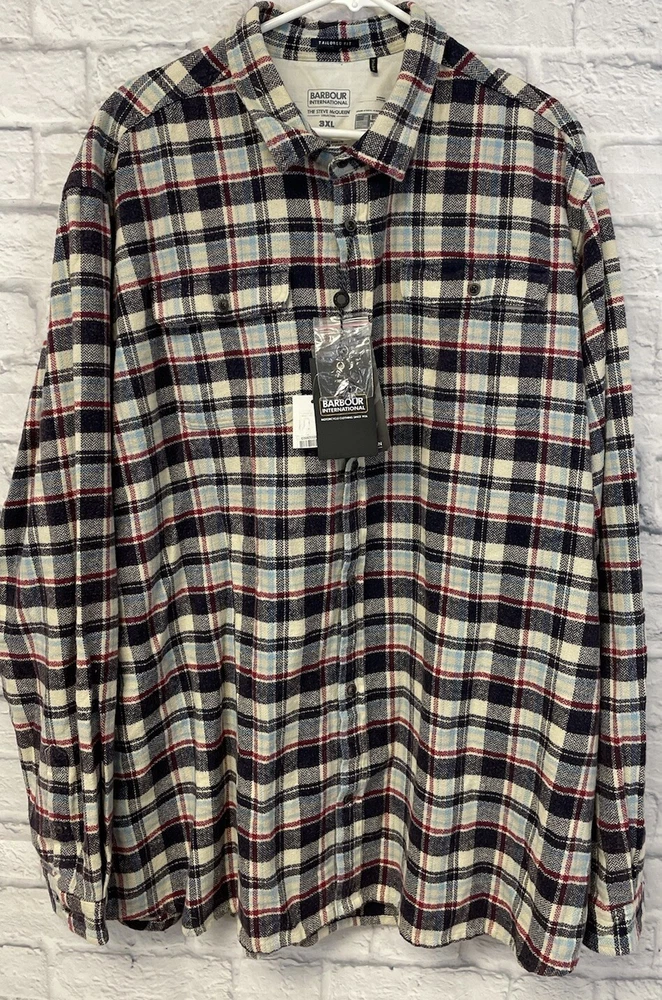 New with tags barbour International x Steve McQueen flannel button up Rick Shirt mens 3XL maroon red black plaid 2 chest pockets 100 cotton measurements in photos