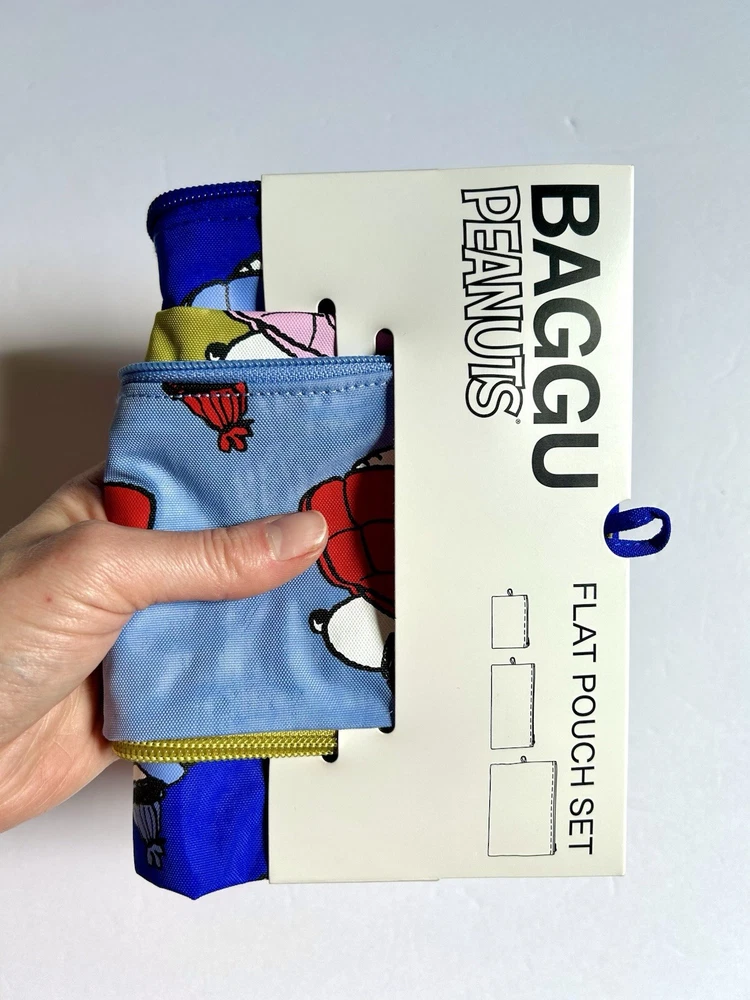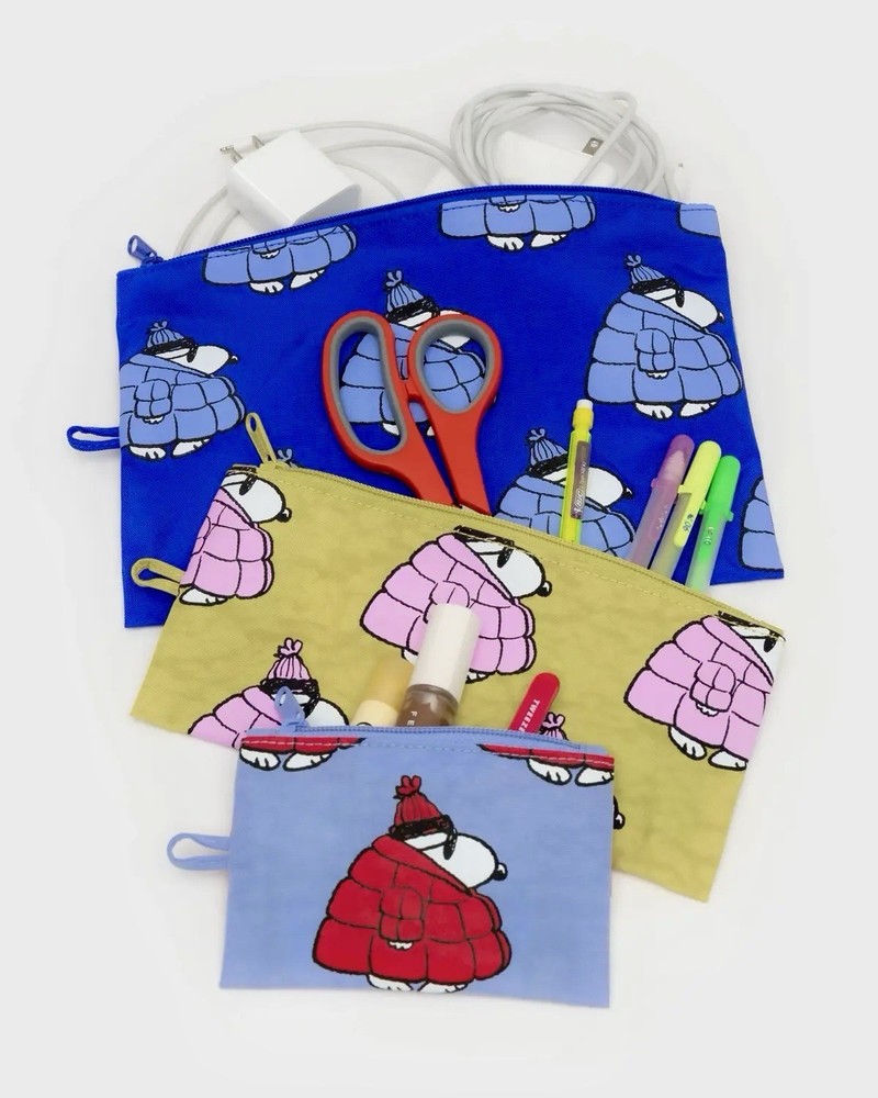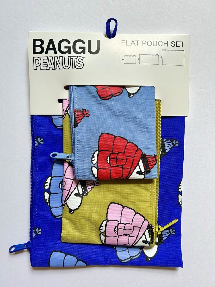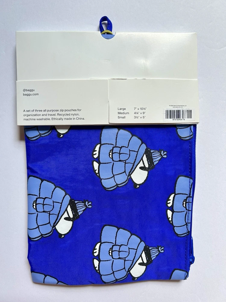 This set of 3 expandable zipper pouches from Baggu—in special collaboration with Peanuts—is in perfect, brand new condition, in original packaging. This Limited Edition set has been discontinued and is completely SOLD OUT and thus RARE and Hard to Find! This collection so fun! It includes three different brightly colored bags patterned with the fun and vibrant Snoopy in a puffer coat print. They are all SO CUTE! Exquisitely functional modern bags with a bit of wacky, retro charm from the patterns, which really pop in these vivid colors. These pouches are fantastically useful, conveniently squeeze super flat yet hold a surprising amount, and are machine washable! A+ product. Note: These bags are not gusseted; they are flat. From Baggu: Have you ever looked out over the surface of a lake, the flat expanse of water begging you to jump in? So you do, and you realize it isn’t flat at all — it’s full of depth and possibilities. These pouches are a bit like that. We could tell you more about them or you could just jump in. A set of three all purpose zip pouches for daily organization. 100% heavyweight nylon / 59% recycled Set of three pouches Large measures 7" × 10 ½" Medium measures 4 ¼" × 9" Small measures 3 ½" × 5" Machine washable Recycled Nylon: Starting with our Spring 2022 collection, all of our ripstop nylon styles are now made with 100% recycled nylon filament yarn (up from 40% recycled before). This 100% recycled nylon yarn is produced from pre-consumer waste, which saves scrap material from being landfilled, conserves petroleum resources, and reduces greenhouse gas emissions.