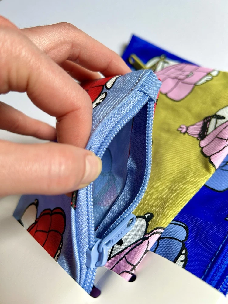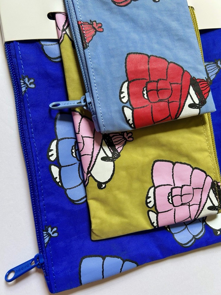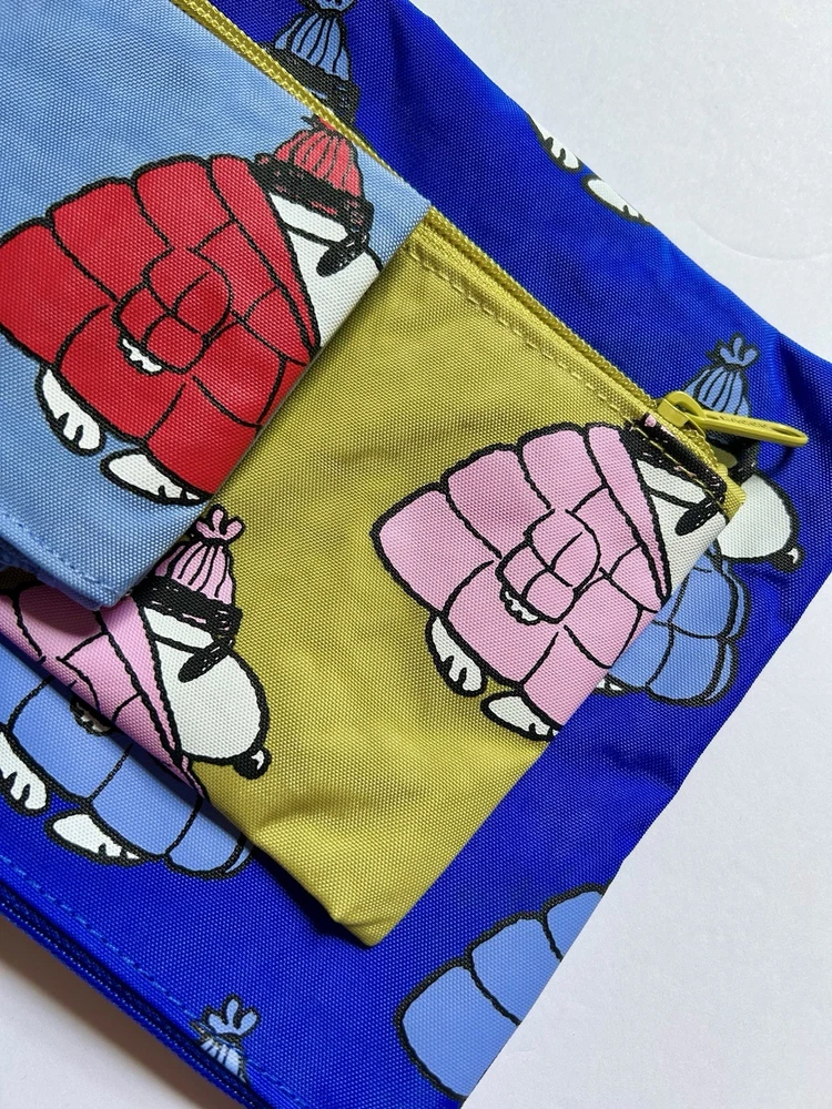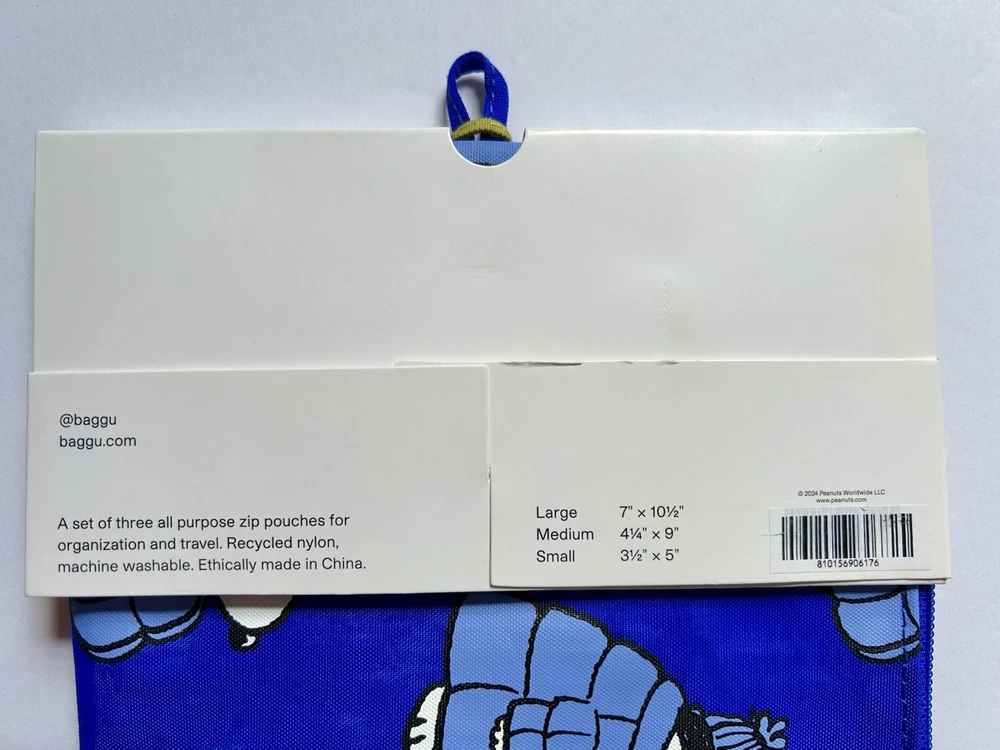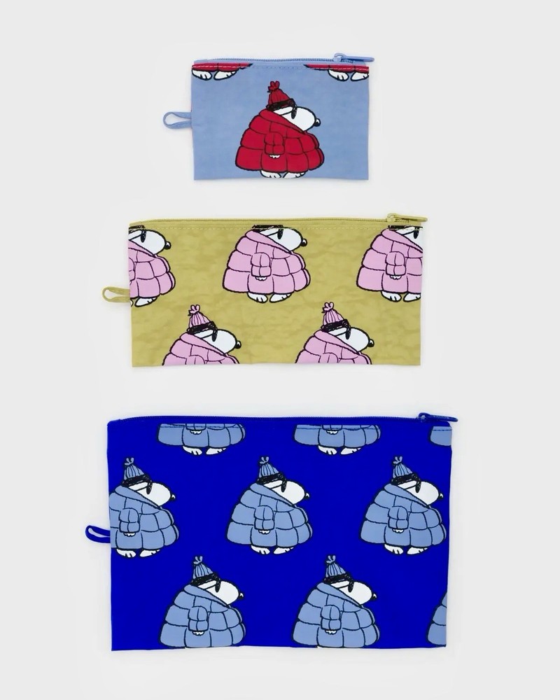 This set of 3 expandable zipper pouches from Baggu—in special collaboration with Peanuts—is in perfect, brand new condition, in original packaging. This Limited Edition set has been discontinued and is completely SOLD OUT and thus RARE and Hard to Find! This collection so fun! It includes three different brightly colored bags patterned with the fun and vibrant Snoopy in a puffer coat print. They are all SO CUTE! Exquisitely functional modern bags with a bit of wacky, retro charm from the patterns, which really pop in these vivid colors. These pouches are fantastically useful, conveniently squeeze super flat yet hold a surprising amount, and are machine washable! A+ product. Note: These bags are not gusseted; they are flat. From Baggu: Have you ever looked out over the surface of a lake, the flat expanse of water begging you to jump in? So you do, and you realize it isn’t flat at all — it’s full of depth and possibilities. These pouches are a bit like that. We could tell you more about them or you could just jump in. A set of three all purpose zip pouches for daily organization. 100% heavyweight nylon / 59% recycled Set of three pouches Large measures 7" × 10 ½" Medium measures 4 ¼" × 9" Small measures 3 ½" × 5" Machine washable Recycled Nylon: Starting with our Spring 2022 collection, all of our ripstop nylon styles are now made with 100% recycled nylon filament yarn (up from 40% recycled before). This 100% recycled nylon yarn is produced from pre-consumer waste, which saves scrap material from being landfilled, conserves petroleum resources, and reduces greenhouse gas emissions.