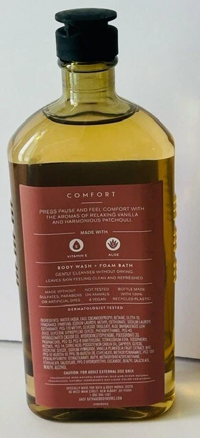 Brand: Bath & Body Works Color: Clear Country/Region of Manufacture: United States Features: Hydrating Size: Regular Department: Unisex Set Includes: Daily Use Ingredients: Aloe Vera, Vitamin E Volume: 10 fl oz Body Area: Full Body Type: Daily Use Product Line: Bath & Body Works Scent: Patchouli, Vanilla Skin Type: All Skin Types Formulation: Fluid, Foam Main Purpose: Wash