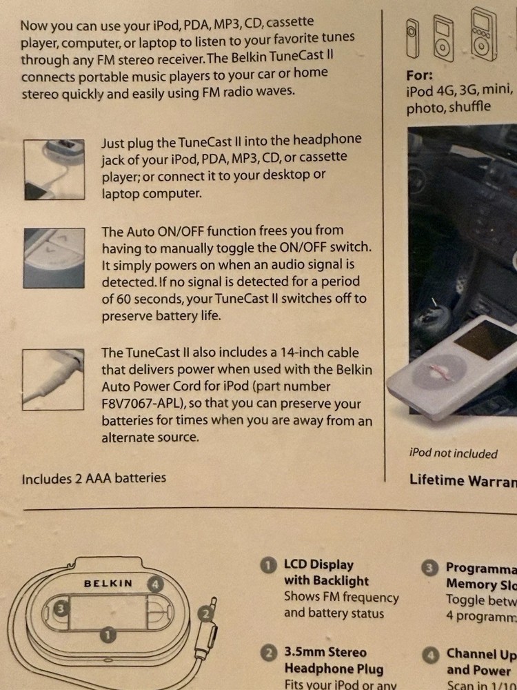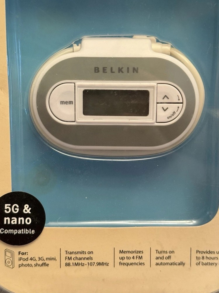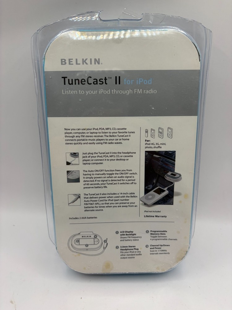 The Belkin TuneCast II FM Transmitter is a portable Bluetooth transmitter designed for iPod Nano compatibility. This sleek white unit from Belkin features FM band capabilities, making it easy to transmit your favorite music to any FM radio receiver. With a simple design and easy-to-use functionality, this transmitter is perfect for on-the-go music lovers looking to share their audio with others. Packaging is a little distressed from shelf wear but is 100% NEW and Unused FREE SHIPPING to USA