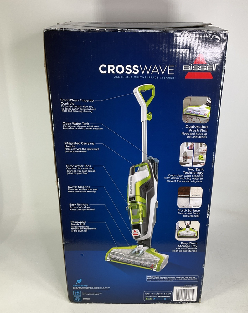 NEW! Box has been opened for inspection and photos. Brand new! Bissell Crosswave All In One Multi-Surface Cleaner Vacuum Model Number: 1785P About Us Customer service is our #1 priority! If for any reason you are dissatisfied with your purchase we offer a 30 day money back guarantee unless otherwise noted in the listing (AS-IS/For Parts - No returns.) We only accept items back in the condition that they were sent to you. Items that are listed AS-IS are not eligible for this money back guarantee. If you are unhappy with your purchase PLEASE contact us BEFORE leaving feedback or contacting eBay so we can work with you to resolve any problems. Shipping When we charge shipping to our customers we only pass on to our buyers exact shipping costs - no added fees. We offer combined shipping for multiple items purchased, so if you purchase more than 1 item from us, please wait for us to combine shipping costs. We require signature confirmation on all items that sell for $750.00 & more per eBay's selling policy. We also insurance all items that sell for $250.00 & more. PLEASE NOTE: WE DO NOT WORK/SHIP ON HOLIDAYS OR WEEKENDS! We use the eBay Global Shipping program for international shipping. DLLR License #991 Please note, we are not an authorized distributor or manufacture's representative of this item. *This product may contain a chemical known to the state of California to cause cancer and birth defects or other reproductive harm*