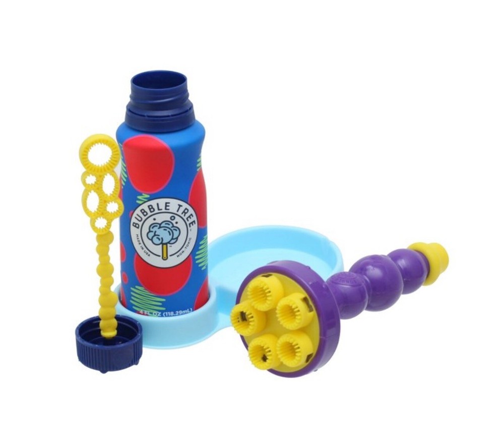 • 1-4 fl. oz. prefilled bubble bottle made from 100% recyclable aluminum that can be refilled. • Custom design wand affixed to cap of aluminum bottle. • 2 N’ 1 deluxe dip tray. Provides 1 space to hold aluminum bubble bottle and another space to hold bubble solution and sound maker bubble flute. • Sound maker bubble flute blows bubbles and makes sound at the same time. • Age grade 3+