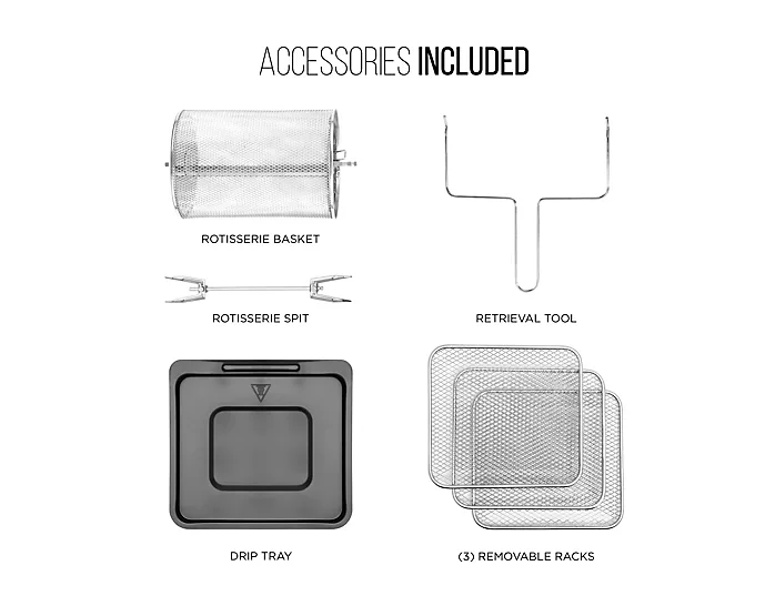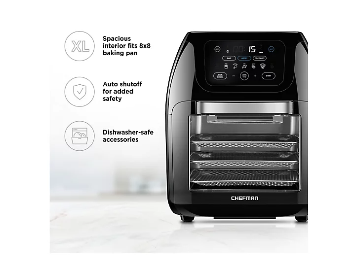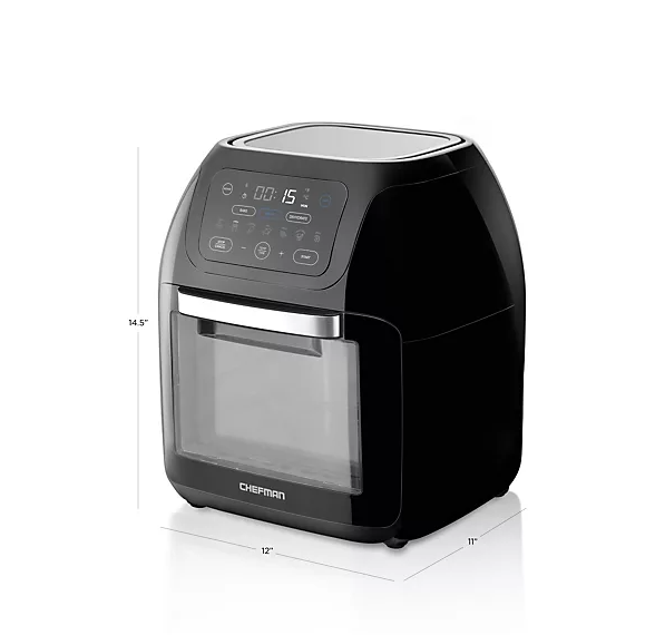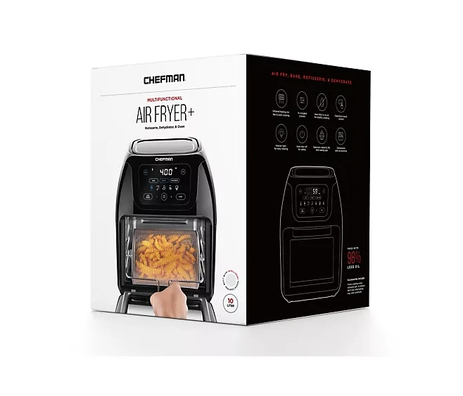 Do it all with this digital air fryer and rotisserie oven. Make juicy rotisserie meats, healthy meals, fruit snacks for the kids, or convection-cook dinners. From Chefman. Includes RJ38-10-RDO-V2 air fryer/rotisserie and accessories 1700 watts Multifunctional, programmable 17 touch screen presents to fry, roast, dehydrate, and bake Auto shutoff Extra large, 10L family size Measures 12.2" x 11.81" x 14.56" Hand wash; stainless steel acces