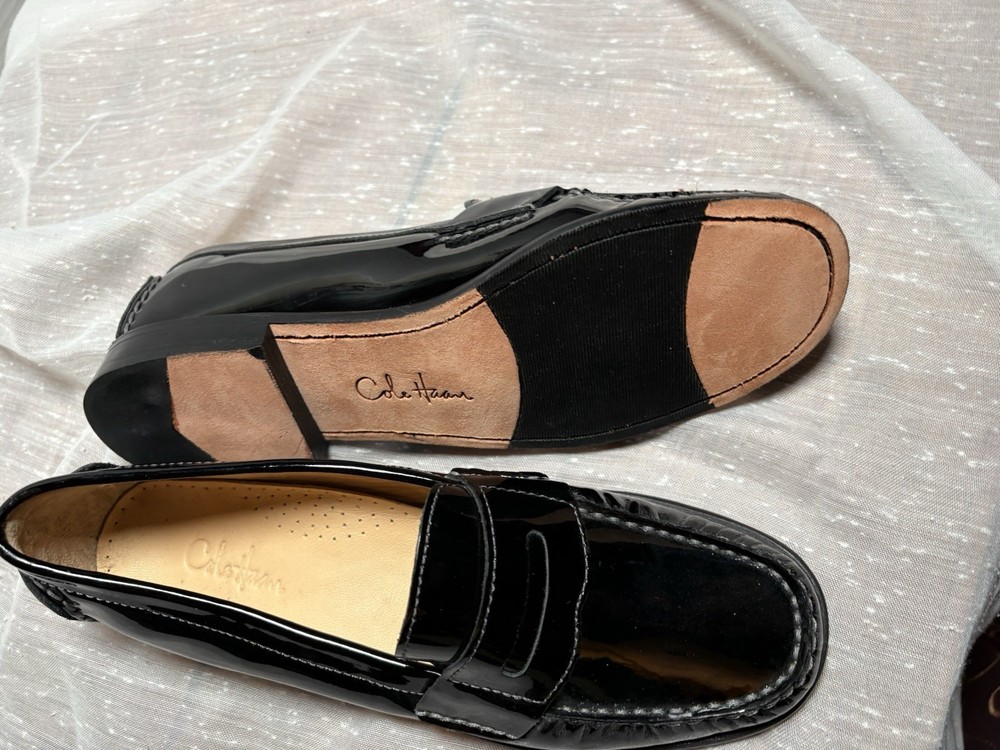 Brand new $165 Cole Haan Penny loafers in black patent leather. Leather sole and heel with rubber non-slip inserts. Leather lined. Size 5.5 B