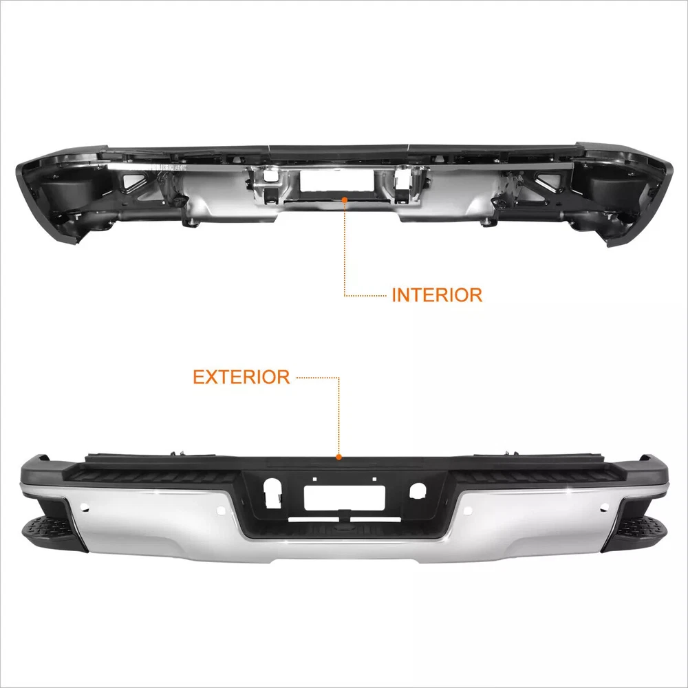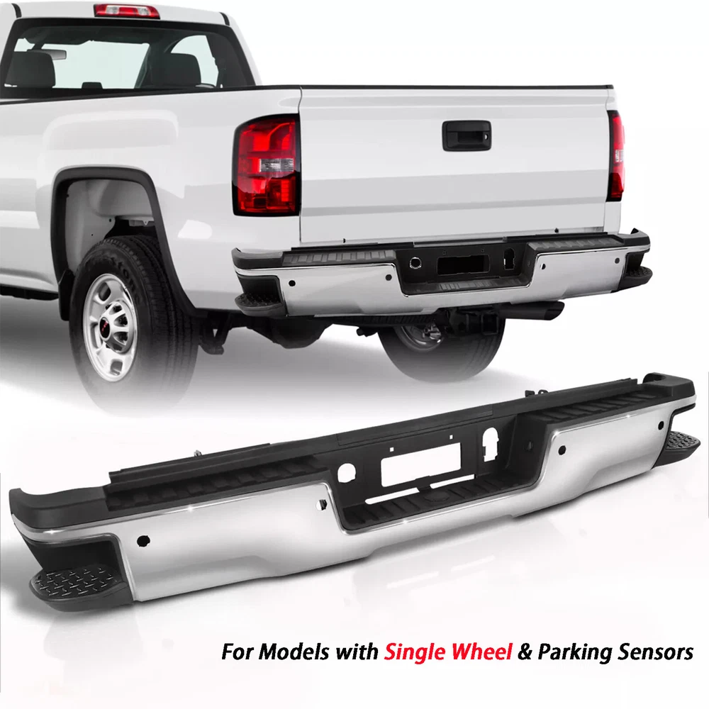 Fitment: 2015-2019 Chevrolet Silverado 2500 HD 2015-2019 Chevrolet Silverado 3500 HD 2015-2019 GMC Sierra 2500 HD 2015-2019 GMC Sierra 3500 HD For Models With Park Sensors For Use With Factory Tow Hitch (Hitch Plate Not Included) High Polished Chrome Finish For Rear Single Wheel Models ONLY Includes Reinforcement, Brackets, Hardware, Lamps and Step Pad Direct OE Replacement