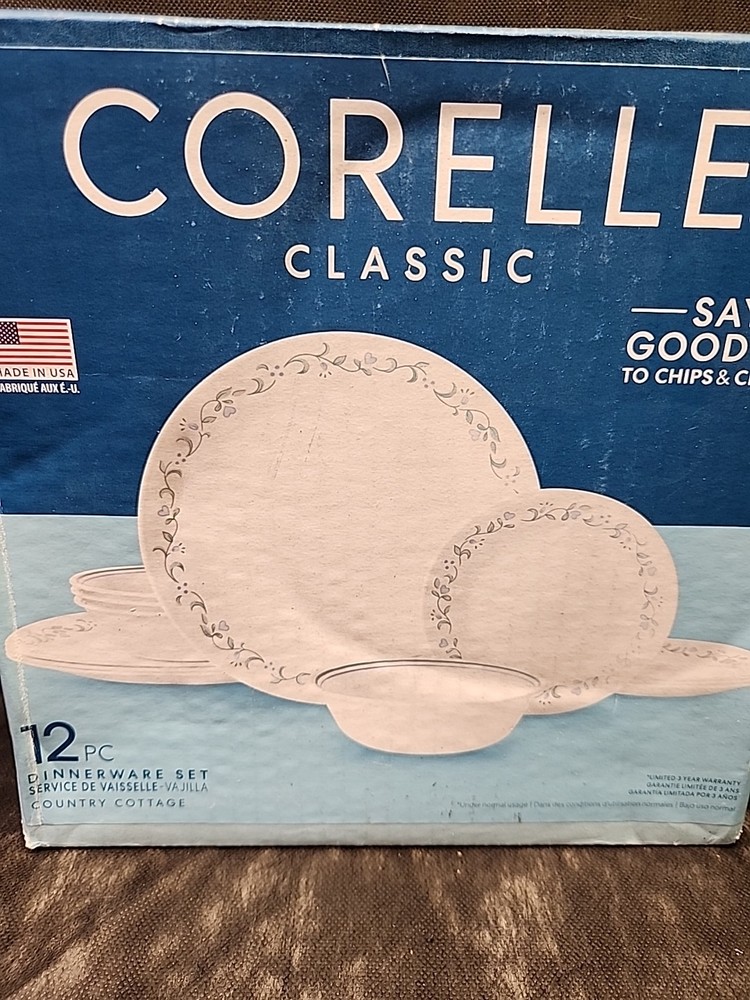 The NEW Corelle Classic Dinnerware set in Country Cottage design features a solid pattern with a round shape and 4 compartments. Made of glass material, this 12-piece set includes dinner plates with a 2-inch diameter. The set is designed for all occasions, with a modern style and features like being microwave, dishwasher, and oven-safe. With its white and green color scheme and country kitchen theme, this Corelle set from the United States is both practical and stylish for any dining table. New, open box
