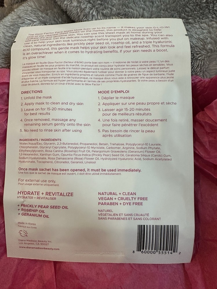 NEW Diana Madison Beauty The Glow Factor Rosehip Seed Oil Hydrating Face Mask.