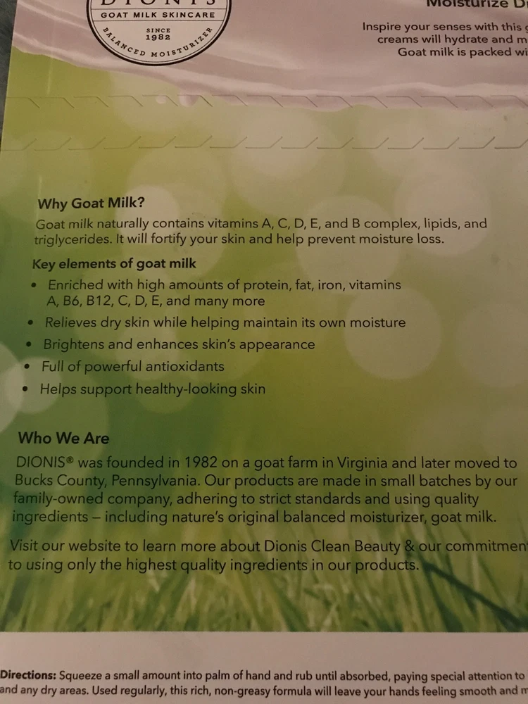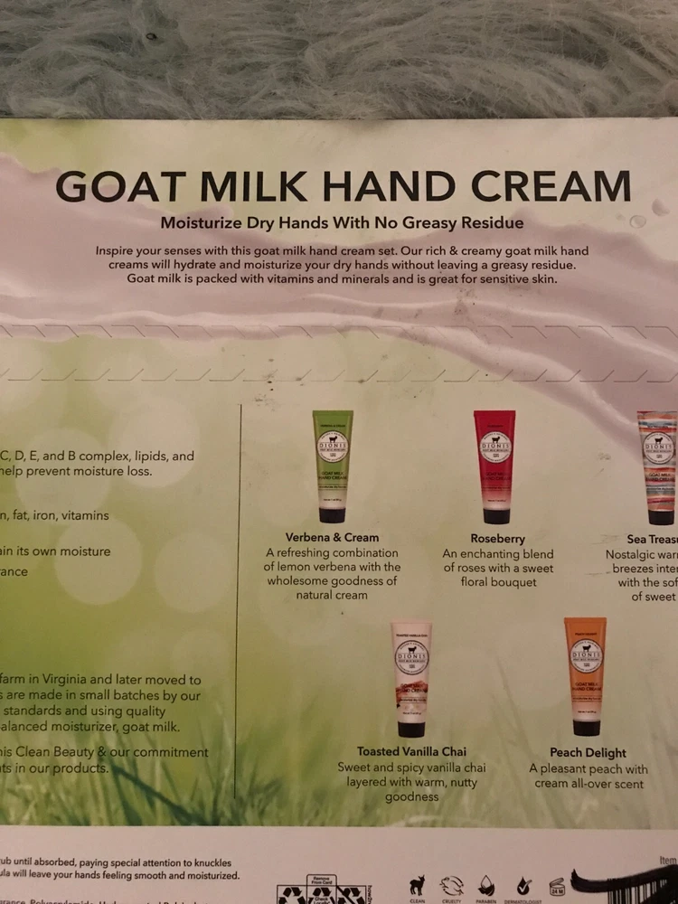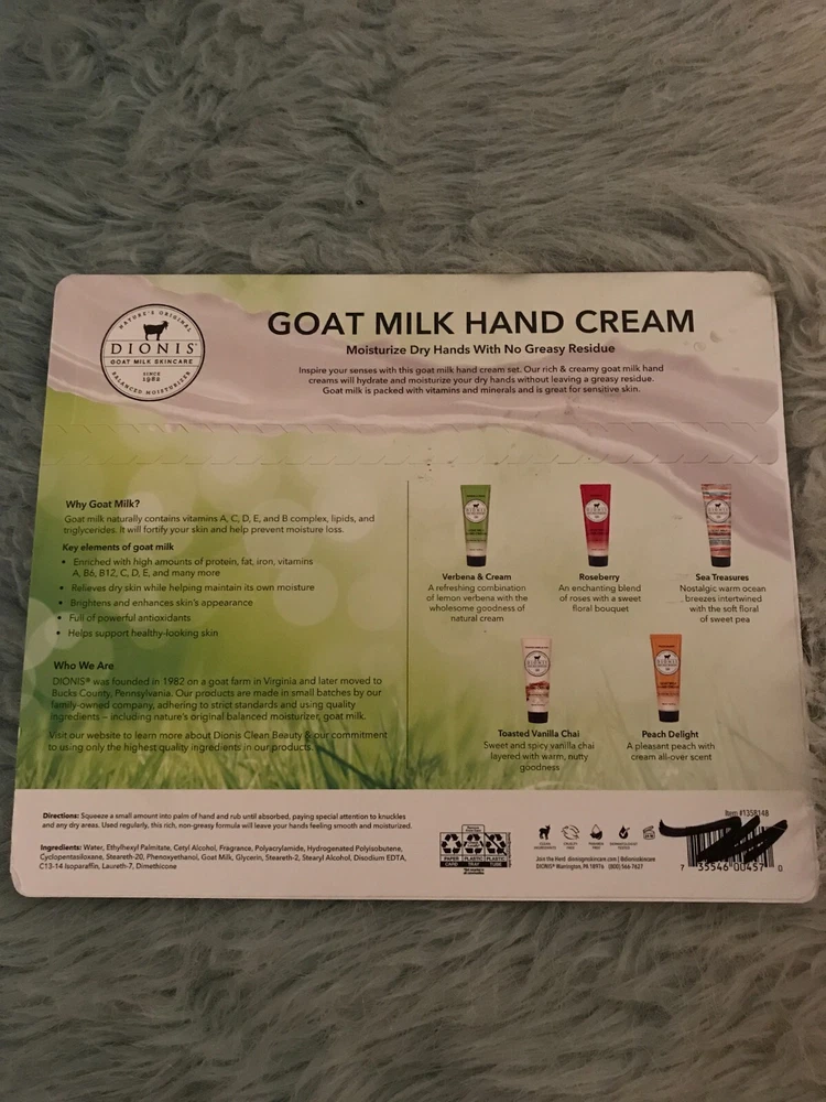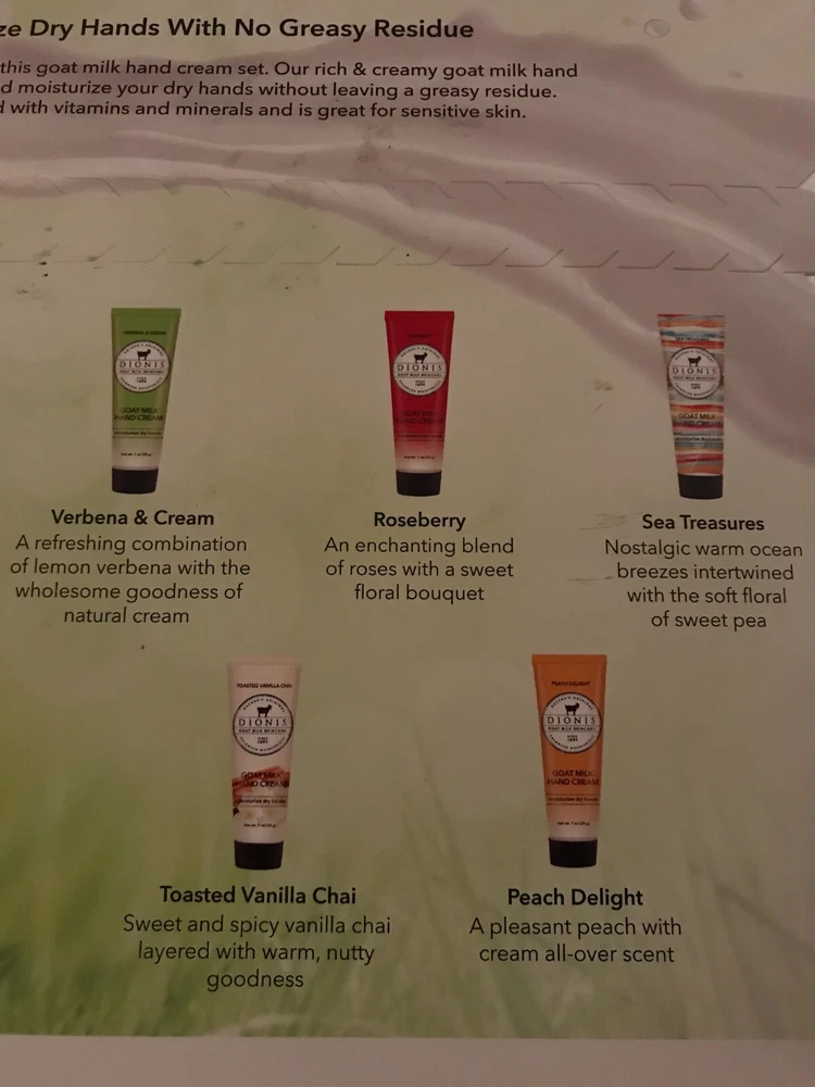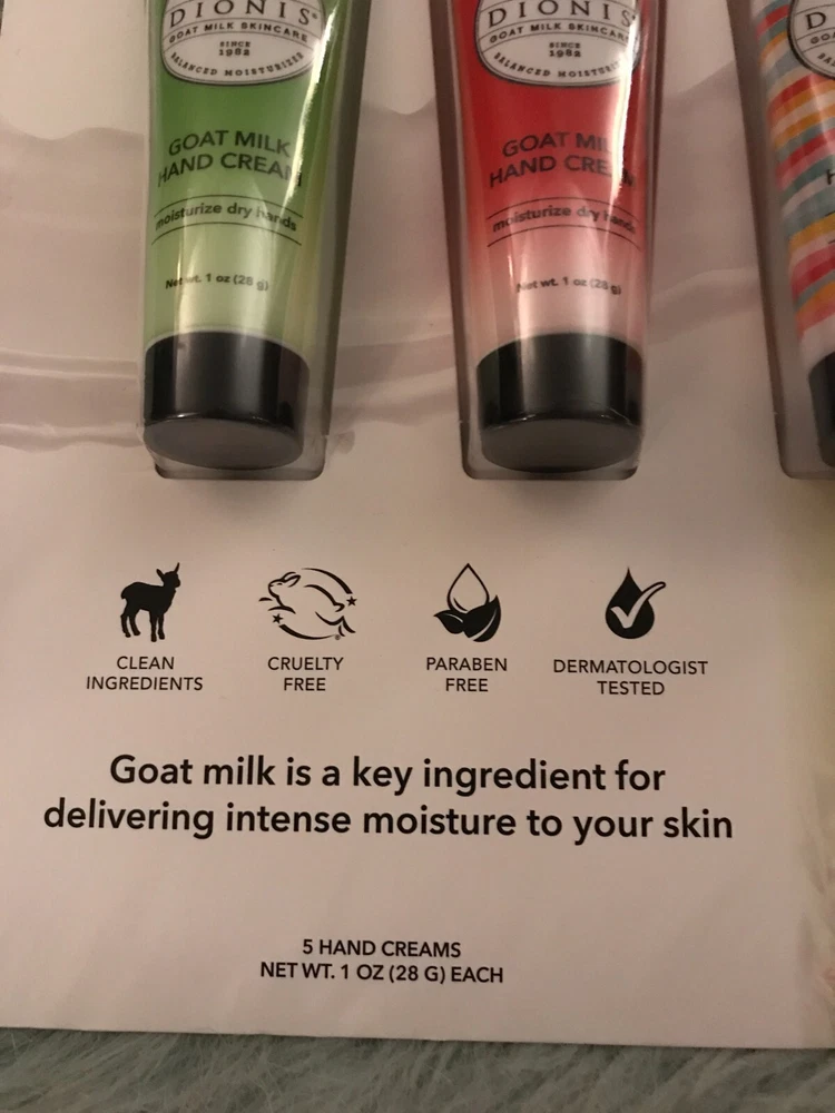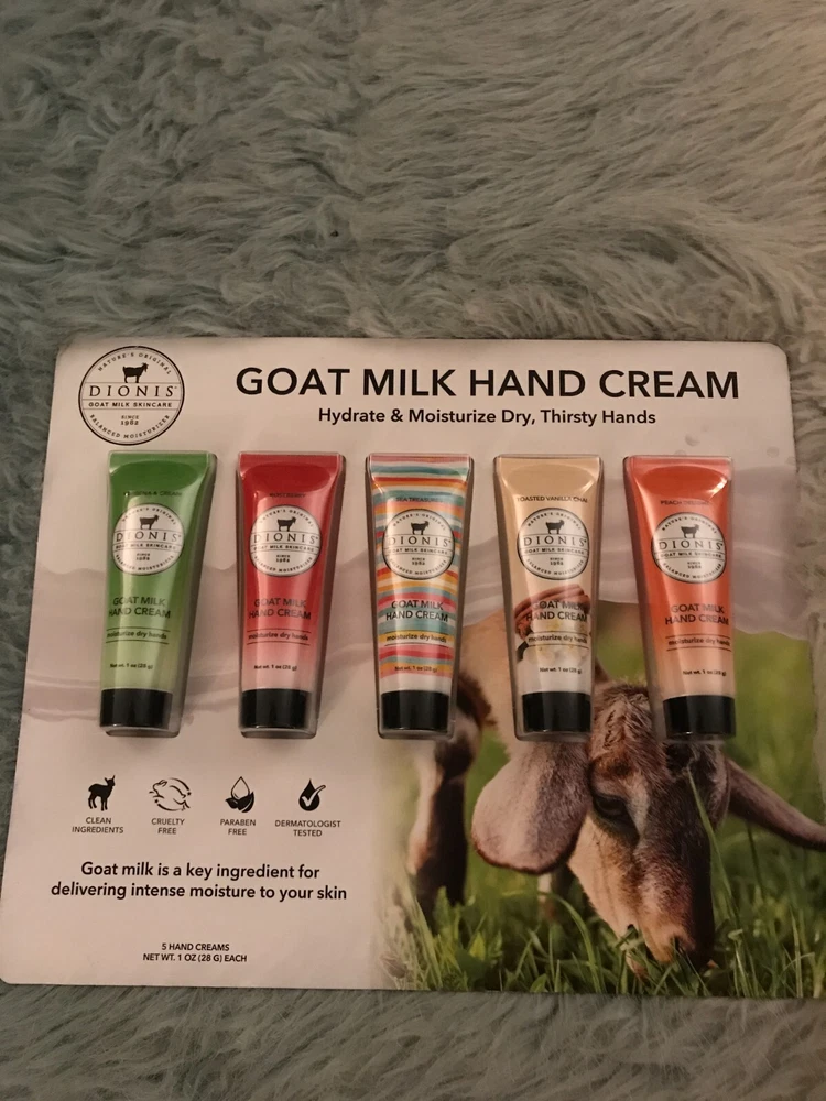 About this item Get Inspired By These Top Fragrances - Get inspired with our five-piece Inspire Goat Milk Hand Cream Gift Set.Featuring top-selling fragrances, this popular set of moisturizing, nutrient-packed goat milk hand creams is perfect for gifting or for yourself. 5 Luxurious Scents - Whether you're in the mood for delightful aurelian lily blossom or the luxuriously fresh rich scent of milky goodness & sweet honey straight from the comb, you'll love every scent in this collection. Great For All Skin Types - Dionis goat milk hand cream products are dermatologist tested, cruelty-free paraben-free, gluten-free, sulfate-free, and made in the USA. For extra sensitive skin, try our unscented options. Feel good about feeling good with Dionis Goat Milk Skincare Products. Responsibly Sourced - Our goat milk is sourced from privately-owned family farms in the United States. These dairy goats are fed a balanced, vegetarian diet, which is full of nutrients, and free of antibiotics, hormones, animal by-products, and preservatives.
