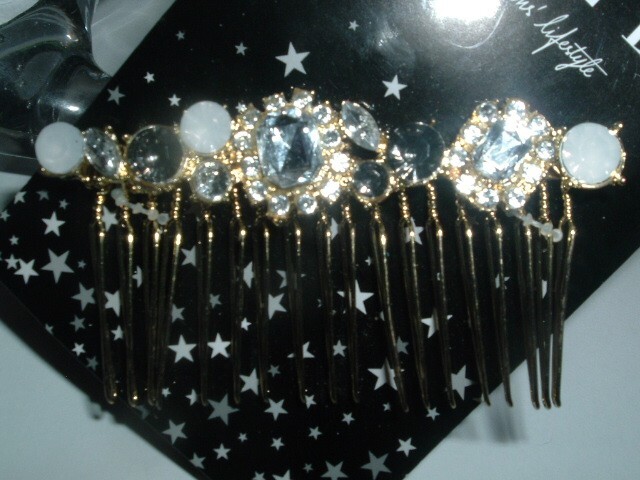 From the closing of a downtown Chicago boutique and still on original "Elle" card, a golden slide hair comb with clear and frosted rhinestones measuring 3" wide. Never worn, condition is excellent, lots of sparkle, beautiful on. We combine ship.