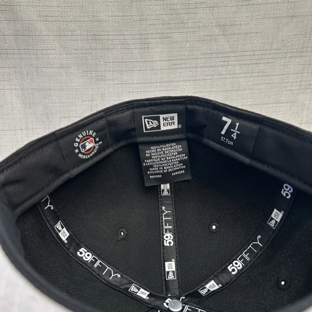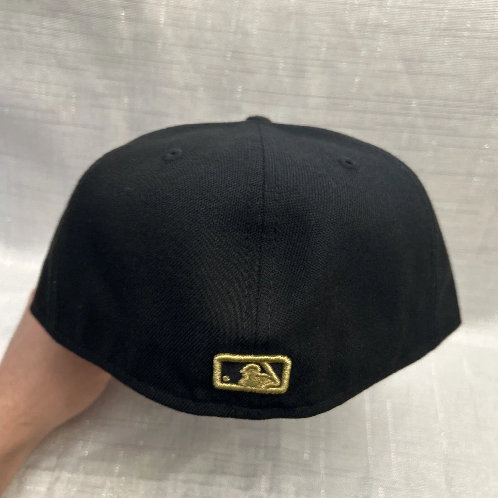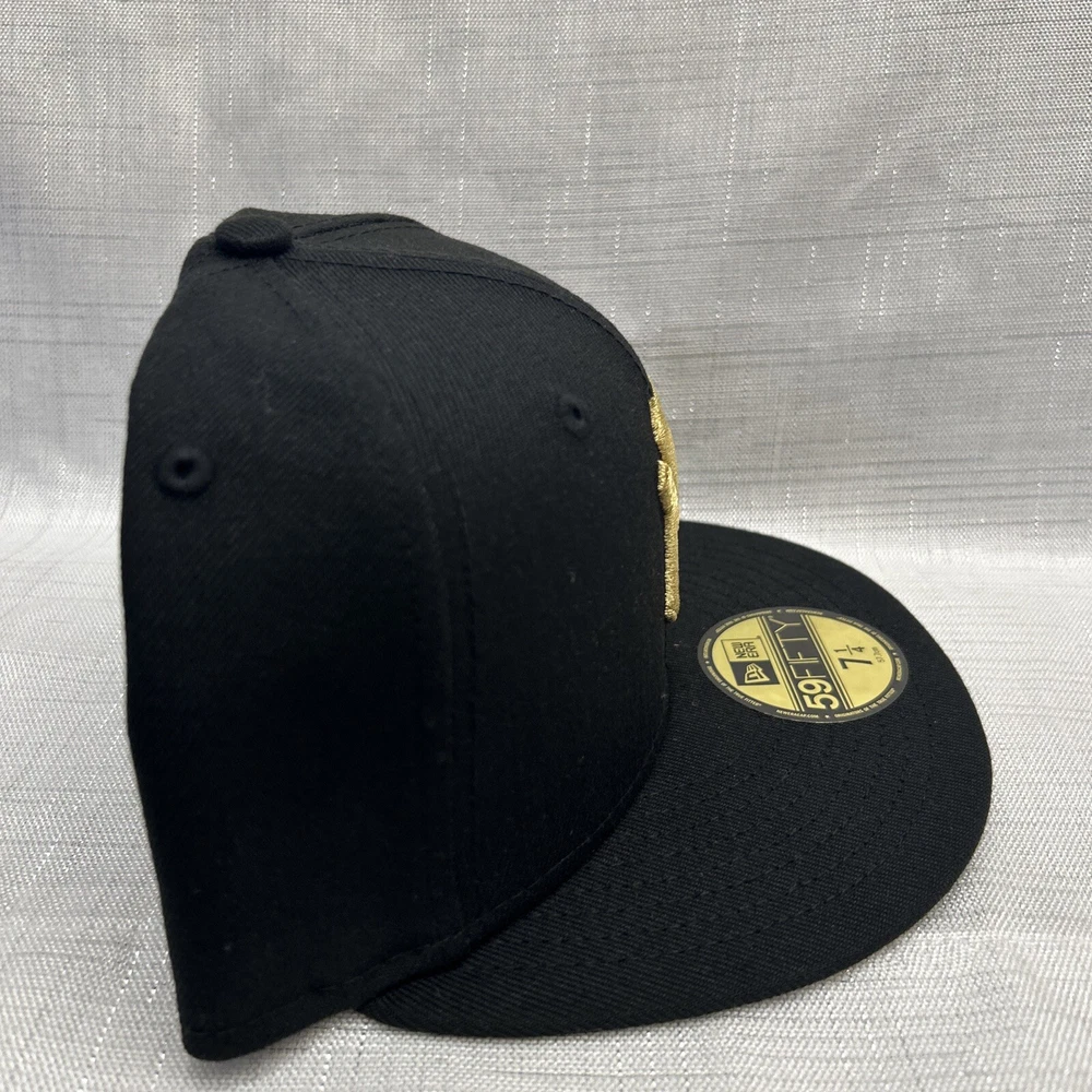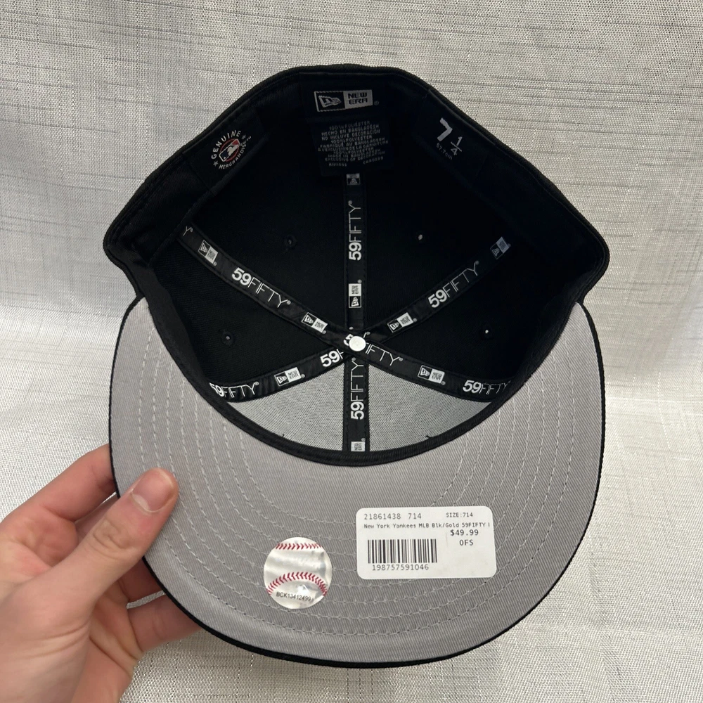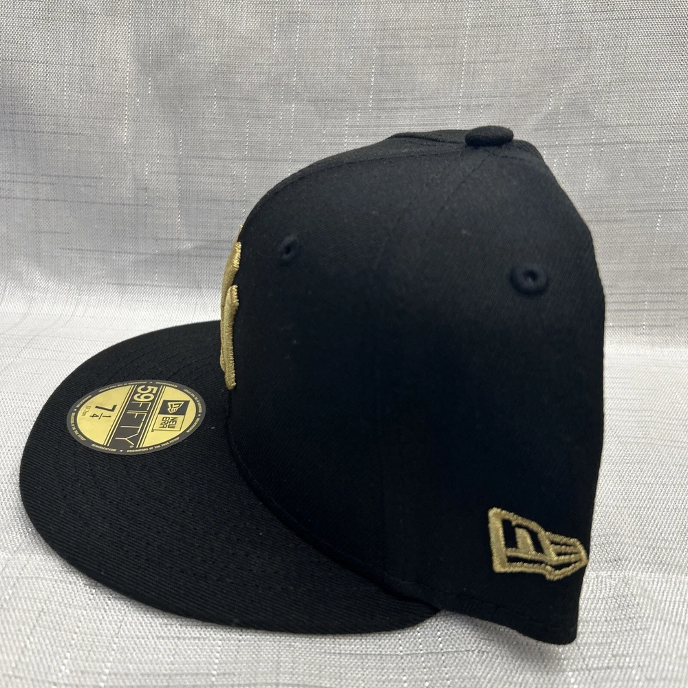 This is a New Era 59Fifty MLB baseball cap featuring the New York Yankees. The cap is in a black color with gold accents, made of polyester canvas material in size 7 1/4. It is suitable for casual occasions and can be worn year-round by both men and women. The cap is not signed or vintage, and it is not personalized or handmade.