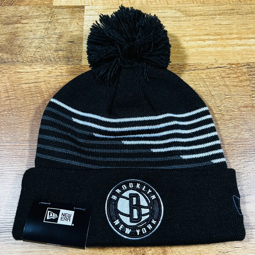 HomeNEW ERA Brooklyn Nets Logo Pom Cuffed Beanie Toboggan Knit Zigzag Hat Cap NWT