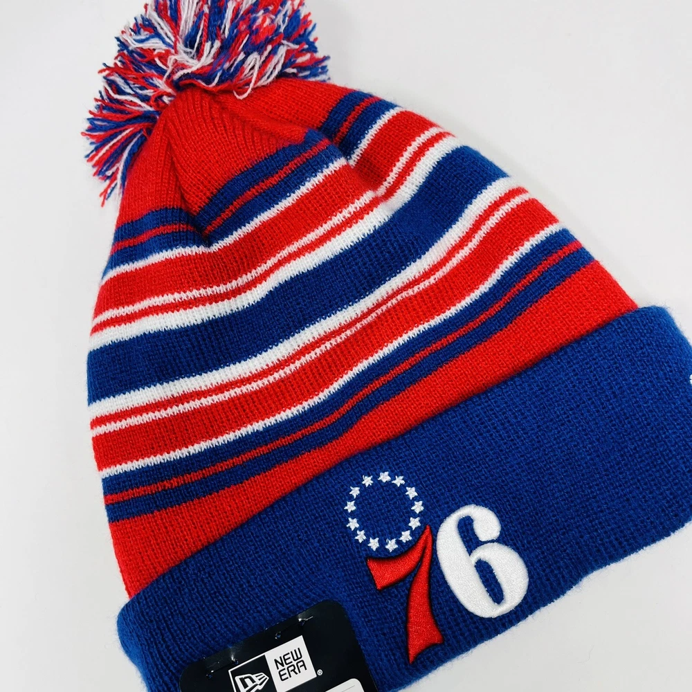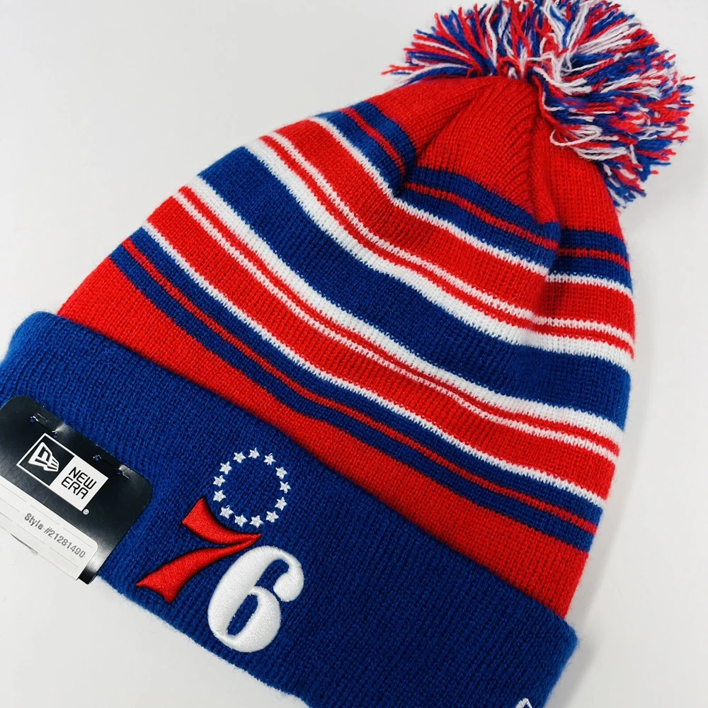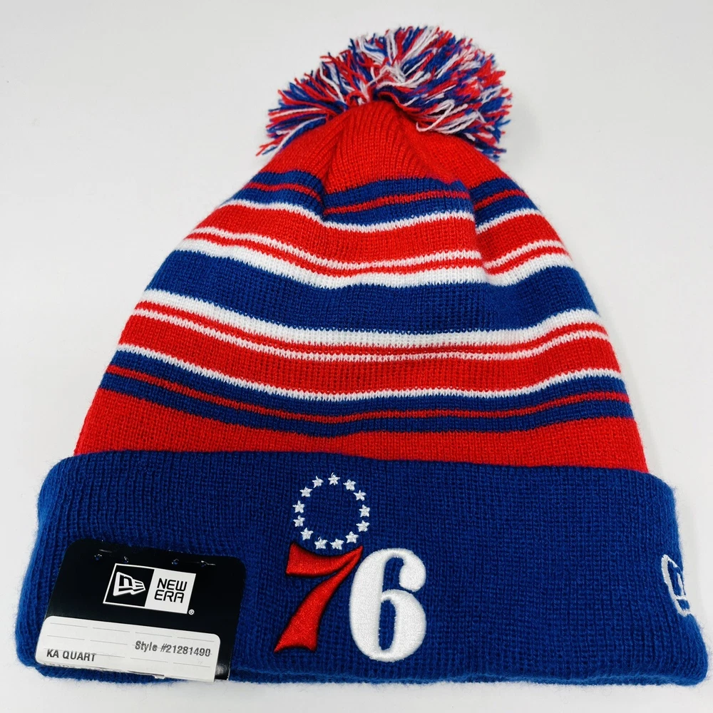 NEW ERA NBA Philadelphia 76ers Mens Pom Cuffed Beanie Toboggan Striped Hat Cap
