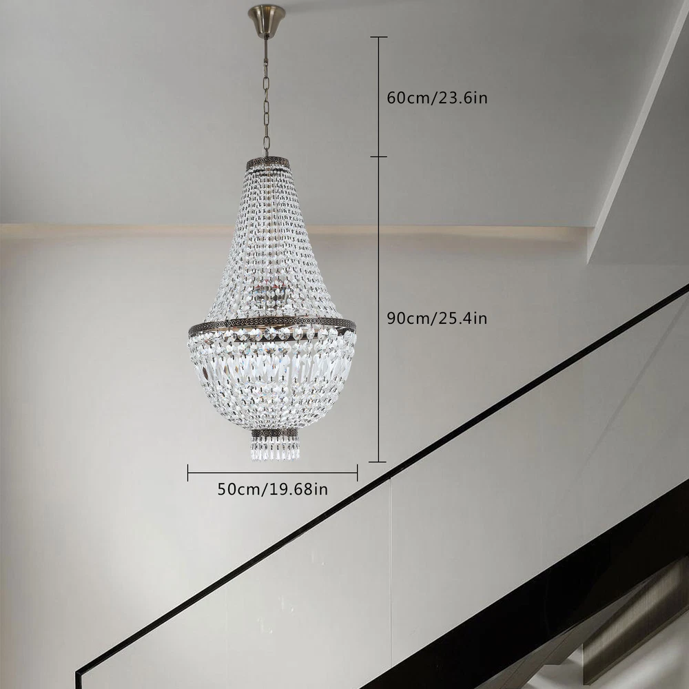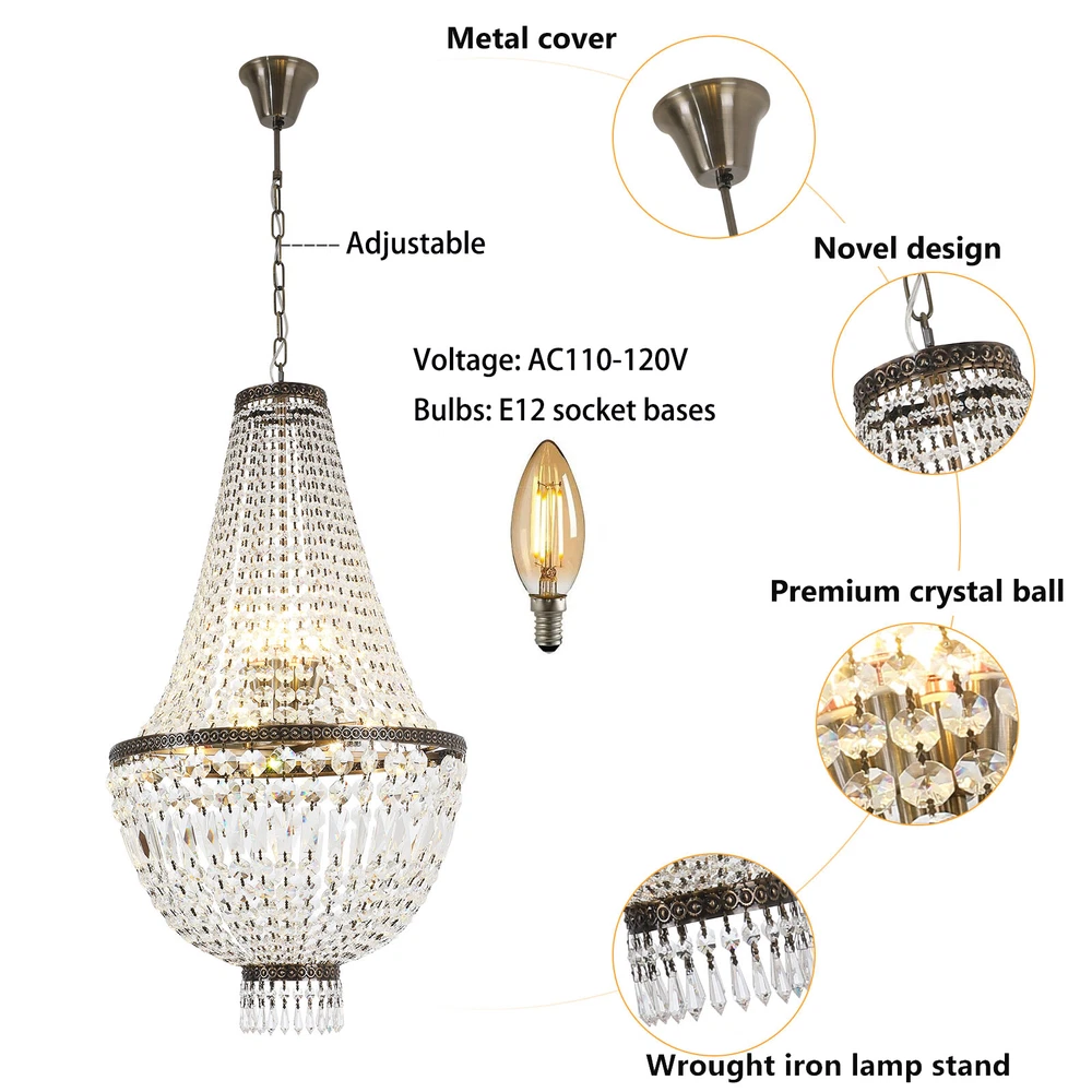 NEW French Empire Chandelier Large Crystal Pendant Light Modern Hanging Lamp E12 NEW French Empire Chandelier Large Crystal Pendant Light Modern Hanging Lamp E12 About this item: High Quality: Solidly crafted with superior quality stainless steel, First-Class crystal , processed in excellent technology, this contemporary chandelier is safety, durable, anti-corrosion no-fading。 Luxury Design: High-End luxurious beautiful design, sparkles from every Angle, it is a gorgeous crystal ceiling light fixture which is far more stunning than the picture. Dimensions of crystal chandelier: 19.68" Diameter x25.4" Height. Canopy: 4.3" Diameter x 1.36" Height. Adjustable chain:23" Length. Hanging crystal chandelier: structured with crystal finishes, this elegant chandelier adds color to any room。 Number of bulbs: This fixture can accommodate up to 9x40-watt incandescent E12 bulbs with maximum candle holder base (not included) Note: This light needs to be assembled. Product description: This chandelier is a feature of the large chandelier that decorates the best castles and palaces in Europe. It reflects the first-class and elegant times and will definitely create a special atmosphere in each home. Specification: Size: H19.68 "xW 25.4" Chain: 23 inches Material: metal, crystal 【8xE12 Bulbs】 It works well with any E12 bulb base, Maximum power: 40W (each bulb), LED or CFL or incandescent,Edison bulbs, (Bulbs NOT Included,each bulb is recommended). Voltage: 110-120V,It can be dimmable when you used with a dimmable bulb and compatible dimmer switch. Note: This light needs to be assembled. If you have any installation issues, please feel free to contact us. Package Content: 1 x Crystal Chandelier 1 x Instruction manual 1 x Hardware bag Installation Instruction: ①For your safety, Please turn off the power before installation ② Please check parts against the packing list to see if the accessories are available. ③We provide install instructions for you. please referred to install manual or have a professional electrician. If need any help, please contact us. Payment Delivery details Terms of sales About us Contact us Payment We accept ebay payment 。 Fees such as import duties, taxes are not included in the item price or shipping costs. These charges are the buyer's responsibility. Delivery details Shipping: 2-9 working days to: USA Terms of sales We maintain high standards of excellence and strive for hundred percent customer satisfaction. Feedback is very important to us. We hope that you contact us immediately before you give neutral or negative feedback, so that we can address your concerns. It is impossible to address issues if we do not know about them! About us Your satis faction is our ultimate goal. We work hard to earn your trust and future business. Our certified technicians have tested each item before shipping. The unit comes with 1 year limited warranty on all manufacturing defects. a) If you receive a defective item, you may return it or ask for a discount. Please contact us within 14 days after you receive the package. b) What you returned must be intact and in its original packaging as re? u. Customer is responsible for shipping costs of the returned item. c) We will cover the cost of shipping back t with the shipping rate indicated in the registration page. We will send you a new unit or refund the full payment you paid. Thank you. Contact us Business Hour Business Hour: Monday To Friday: 8:30 AM to 5:00 PM (Beijing China time) Due to time zones, our reply to your questions may not be immediately. But within above working time, we will reply your email within 24 hours. If it's non-workdays, please kindly be patient and wait till Monday. Please contact us with ebay message. Please feel free to contact us if you have any questions. Monday To Friday: 8:30 AM to 5:00 PM (Beijing China time) Due to time zones, our reply to your questions may not be immediately. But within above working time, we will reply your email within 24 hours. If it's non-workdays, please kindly be patient and wait till Monday. Please contact us with ebay message. Please feel free to contact us if you have any questions. Warranty 5 years Manufacturer Warranty 4 Years Feature 1 Creative Design,Durable Material,Beautiful Appearance * Feature * Easy installation,Convenient Use,Easy Operation Year of manufacture 2023 Features Durable Surface Finish Made of high quality material Brand Unbranded Type Chandelier Size H19.68 "xW 25.4" Chain 23 inches Material metal, crystal Style Modern Room Attic, Bar, Dining Room, Entryway, Kitchen, Living Room, Utility/Laundry Room Power Source Corded Installation Area Indoor Color Green Patina