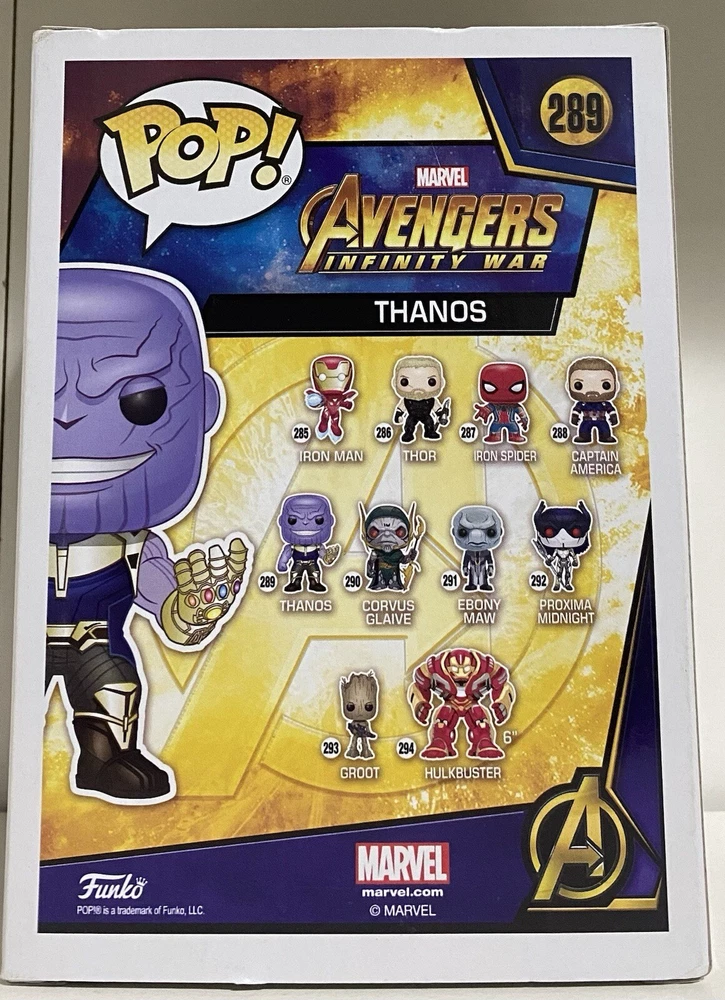 Color: Multicolor Theme: Comics, Movies Features: Exclusive, Vaulted, Chase, Collaboration, Common, Limited Edition Packaging: Original (Opened) Character Family: Marvel Avengers Series: Avengers: Infinity War Series 1 TV/Streaming Show: Avengers gtin13: 889698264679 Material: Vinyl, ABS Plastic UPC: 889698264679 Franchise: Marvel Age Level: 12+ Collection: Marvel Box Number: 289 Exclusive Event/Retailer: Funko Brand: Funko Character: Thanos Type: Vinyl Figure, Pop! Vinyl Animation Studio: Funko Movie: Avengers: Infinity War MPN: 26467 Product Line: Pop! Vinyl Model: Infinity War Infinity Modified Item: No Size: Standard Featured Person/Artist: Thanos Country/Region of Manufacture: China