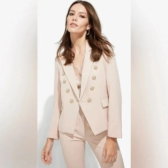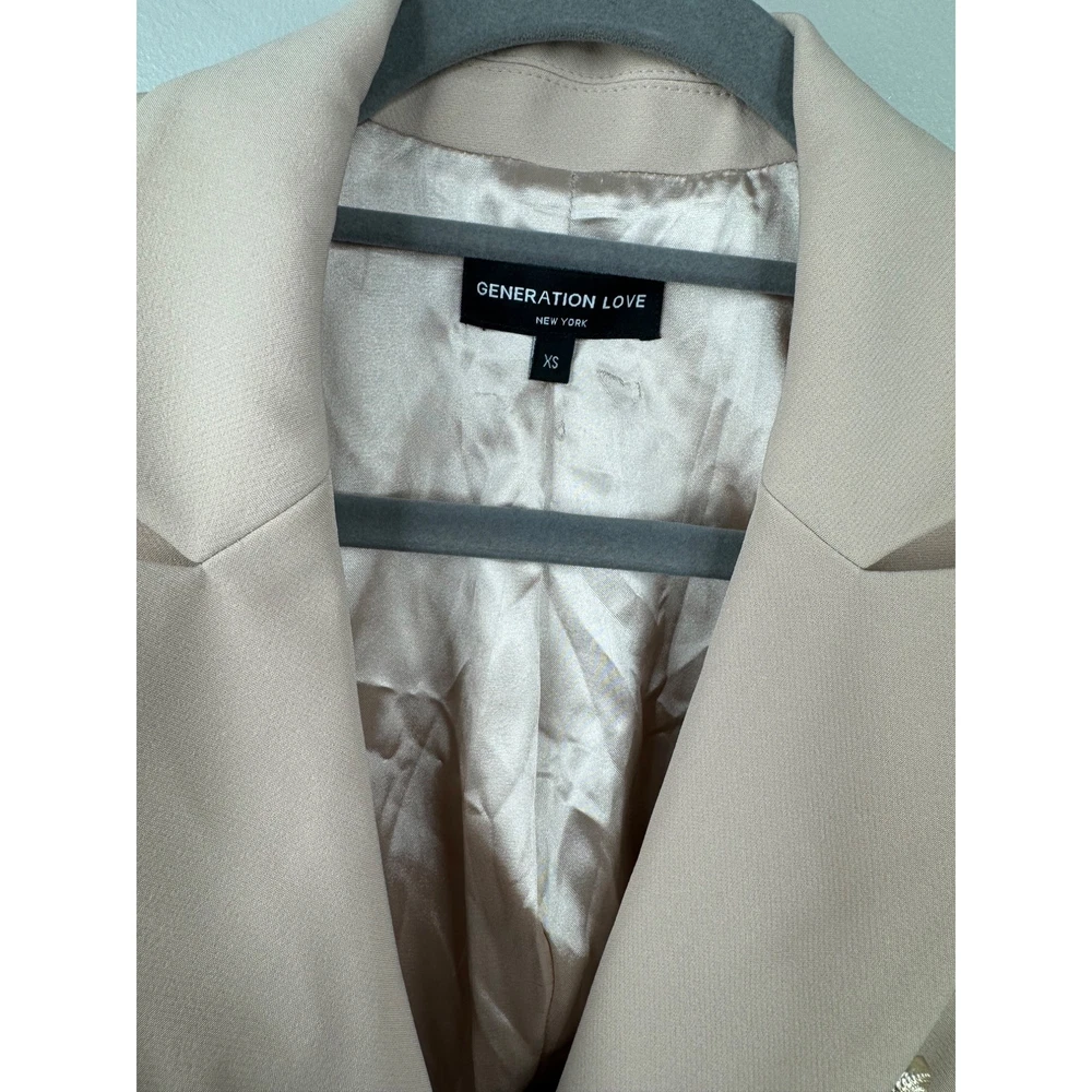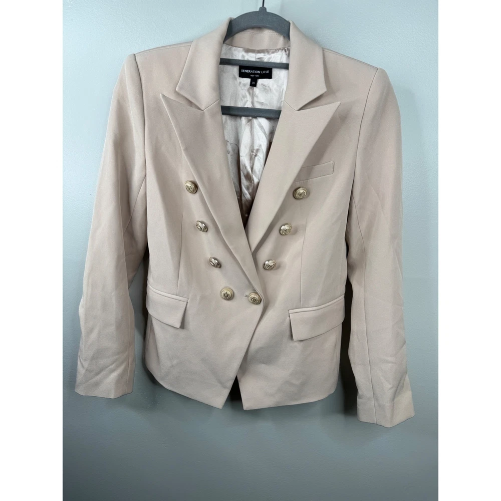 GENERATION LOVE Delilah Crepe blazer in Latte (Cream) Size XS Decorative Gold Buttons New w/ out tags The inside under the tag has a little mark from the store sticker Retail $385 Peak lapels Double-breasted button closures Bracelet-length sleeves, four-button cuffs Flap waist pockets Lined 95% polyester/5% elastane; lining: 95% polyester/5% elastane Armpit to armpit: 16.5" Back Length: 21" Front Length: 23" Tags: Moto, Generation Love, Revolve, Barbie, Preppy, Hot girl, Summer, Resort, soho, Hamptons, Cali, travel, Biker, Office, Work, Fun, Date night, Vacation, Business, Casual, Party, Features: • Blazer Size: Womens XS Condition: New Without Tags