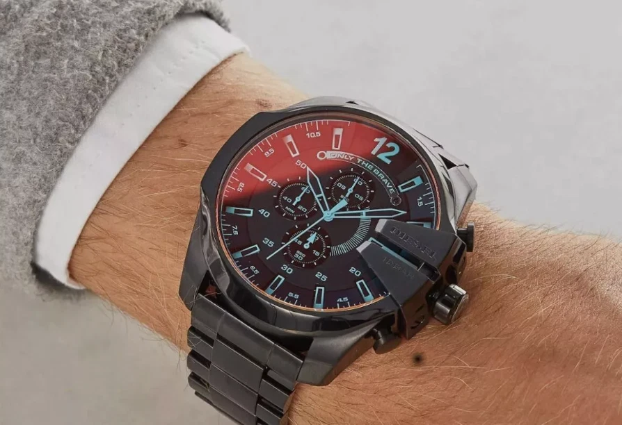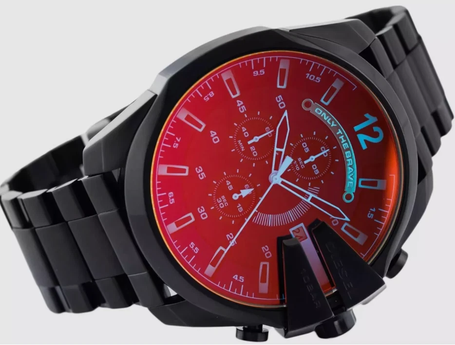 Bezel Color Black Year Manufactured 2020-Now Indices Stick Indexes Vintage No Closure Fold-Over Push-Button Deployant EAN 0698615095414 Handedness Left Caseback Solid Department Men Lug Width 26 mm Case Size 51 mm Case Material Stainless Steel, Stone, Crystal Water Resistance 100 m (10 ATM) Brand Diesel Band Color Black Dial Color Red, Silver, Blue, Black Band Width 26 mm Band/Strap Bracelet Case Thickness 11 mm Case Color Brown, Blue, Black Watch Shape Round Style Diver, Sport, Luxury, Dress/Formal, Casual, Classic Features Water-Resistant, Acrylic Crystal, 12-Hour Dial, Chronograph Movement Quartz Reference Number DZ4318 Type Wristwatch Band Material Stainless Steel, Leather Model Mega Chief Case Finish Polished Display Analog MPN DZ4318