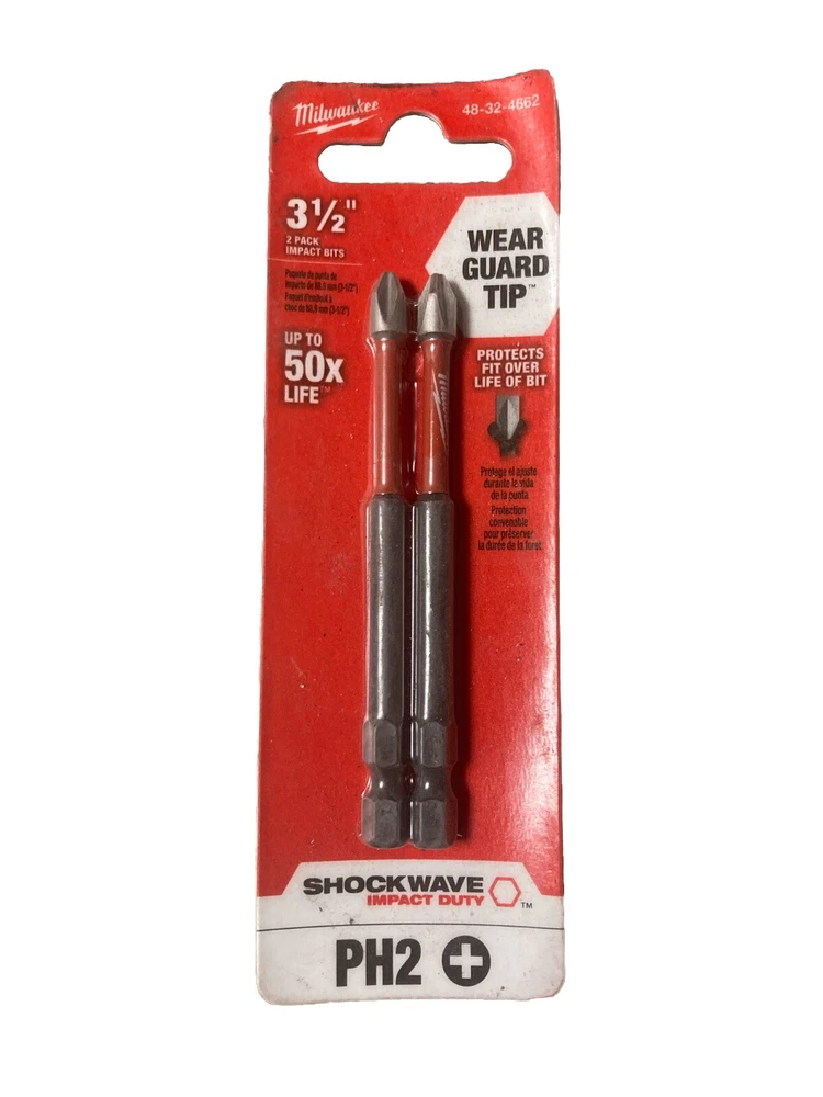 The NEW GENUINE MILWAUKEE Shockwave Impact Duty 3-1/2” #PH2 Phillips Bit 48-32-4662 is a set of two Phillips driver bits designed for use with a drill. The bits are made of steel with a 1/4 inch belt width and a silver color. They are part of Milwaukee's Shockwave Impact Duty line, known for its durability and performance. These bits are ideal for various drilling tasks and provide reliable support for driving screws and fasteners. Brand new - never opened Minor cosmetic scuff marks on packaging overall in excellent condition (see pics) ***FAST SHIPPING*** SAME DAY / NEXT DAY