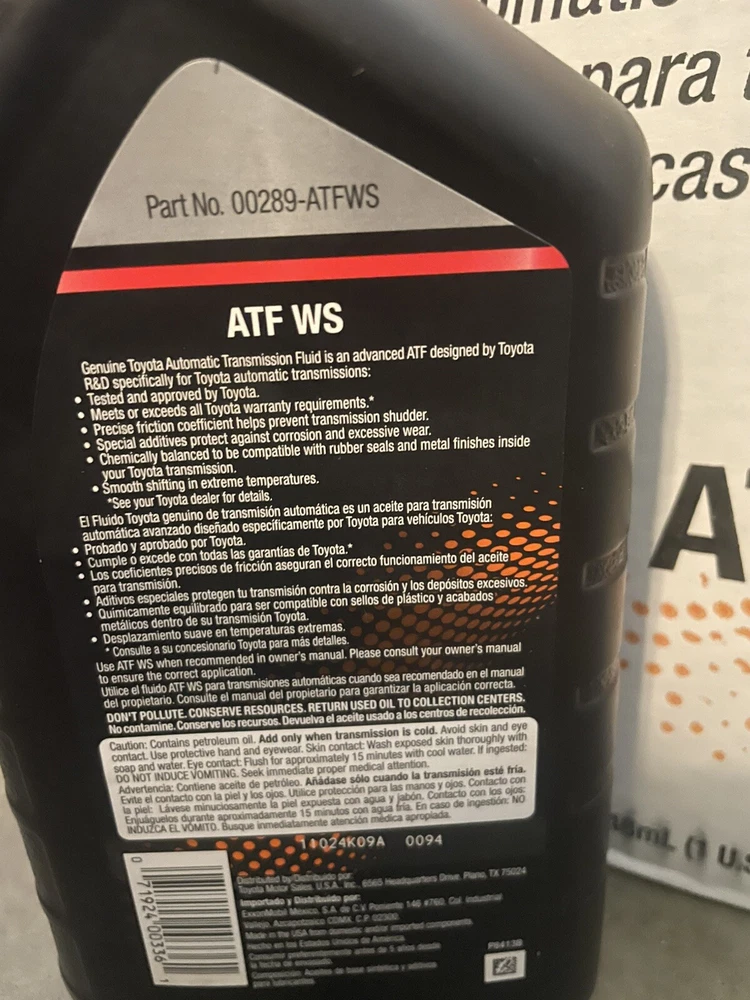Type:Type WSBrand:ToyotaCountry/Region of Manufacture:United StatesManufacturer Part Number:00289-ATFWSPackage Quantity:6 QUARTSUPC:Does not applygtin13:Does not applyTransmission Type:Automatic Transmission Fluid