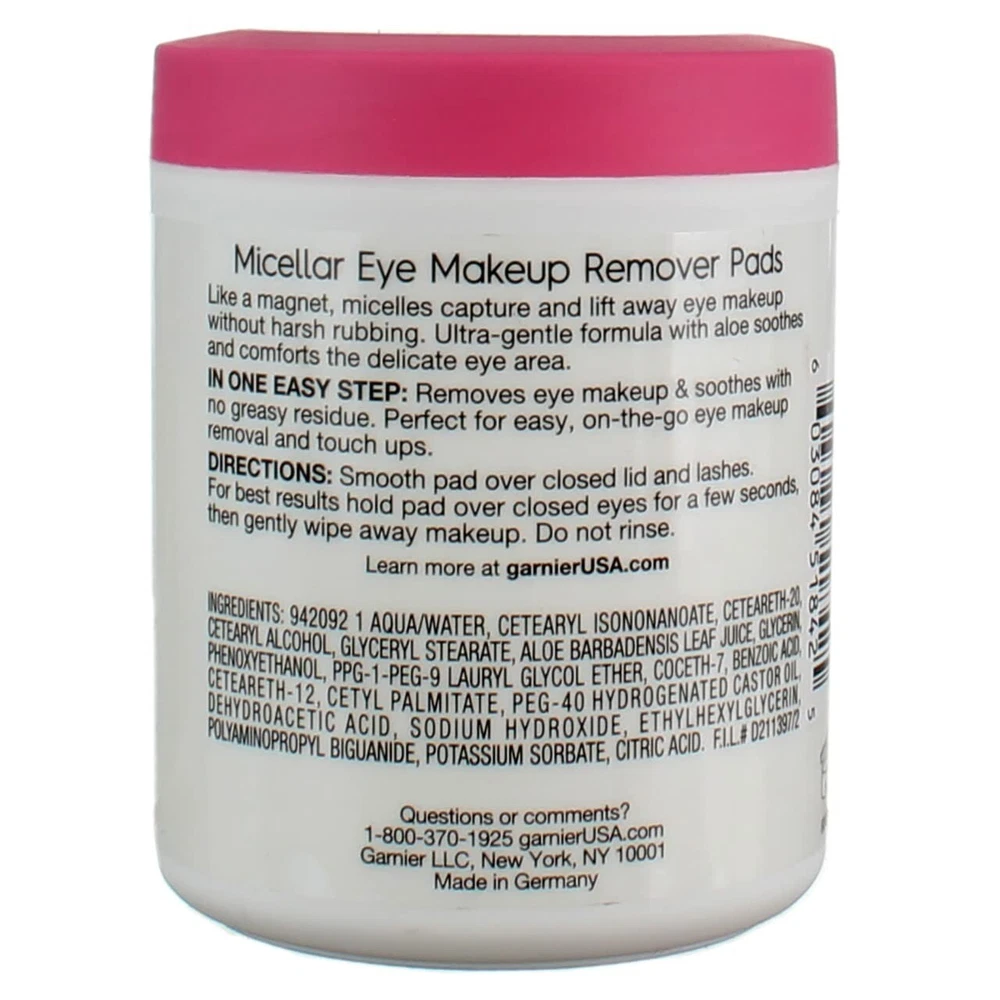 Oil-free Micellar eye makeup remover pads Removes eye makeup and soothes skin with no greasy residue These Garnier makeup remover pads are soft, pre-moistened and won't dry out Ultra Gentle Formula that works without harsh rubbing Ophthalmologist and Dermatologist tested NOTE: A brand-new, unused, unopened, undamaged item in its original packaging