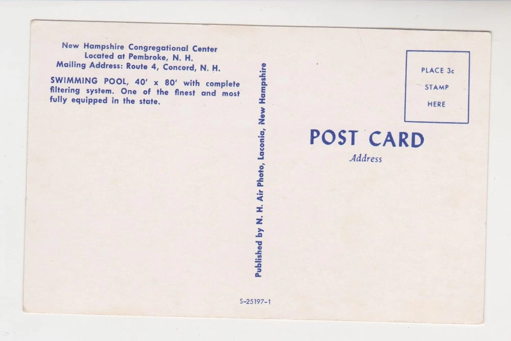 NEW HAMPSHIRE CONGREGATIONAL CENTER, PEMBROKE – SWIMMING POOL - 1950s Postcard. This postcard measures 3½ by 5½ inches and is in good condition, see scans. Back: New Hampshire Congregational Center – Located at Pembroke, N.H. – Mailing Address: Route 4, Concord, N.H. – SWIMMING POOL, 40’ x 80’ with complete filtering system. One of the finest and most fully equipped in the state. – Published by N.H. Air Photo, Laconia, New Hampshire. Please look at the scans and you will have a better of idea of the condition of our postcards. If you have questions, or want more pictures, please email us and be sure to check our other auctions for other interesting items. Buyer pays S&H of $1.00 in the United States. I only use Ebay’s Global Shipping Program, no other international shipping. If you purchase more than one postcard, please don't pay until I send you an invoice. We will combine shipping costs for multiple purchases. THANKS FOR LOOKING!!!