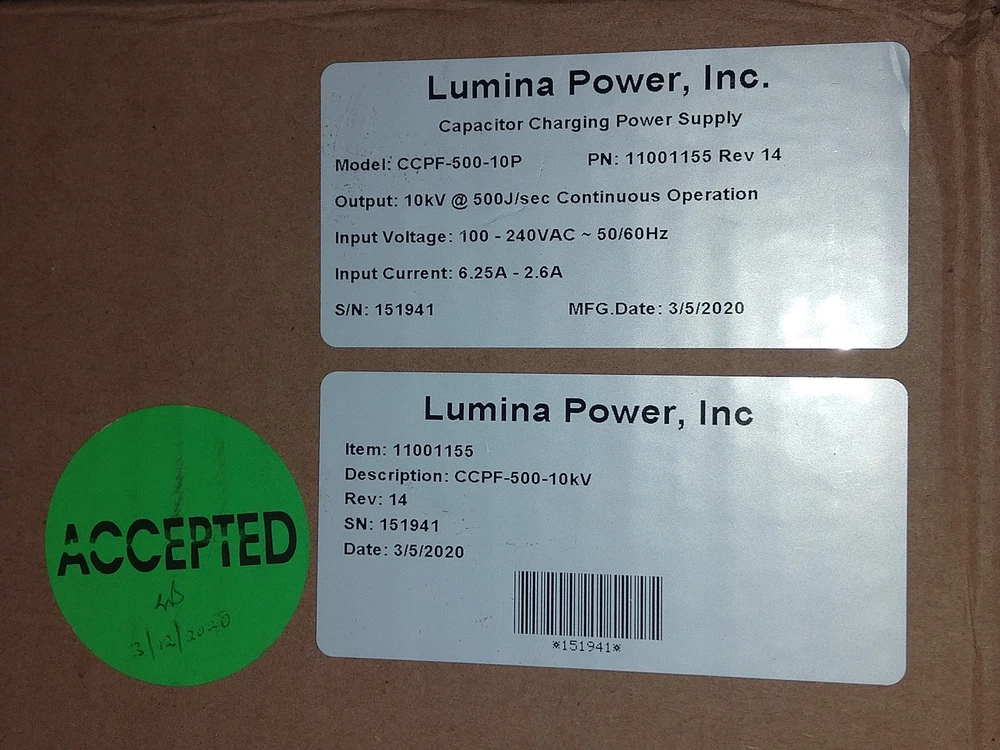 NEW IN BOX Lumina Power Capacitor Charging Power Supply CCPF-500-10P We gladly ship Worldwide* Scroll down for more Photos and details NEW IN BOX Lumina Power Capacitor Charging Power Supply CCPF-500-10P Never used in the original opened box. Don't forget to place your bid. More photos down below By bidding on this auction you agree to the following terms: Shipping Terms: Buyer pays all shipping costs. Let us know if there is an issue with the shipping costs, as they are automatically calculated by ebay. Shipments made to California must include 7.75% sales tax unless we are provided with a valid resale certificate. We reserve the right to ship with Fedex , USPS, UPS and any other carrier in the best interests of both the buyer and seller. If the shipping cost quoted is over $150, that means it will be shipped freight, and the price quoted is for pickup at a freight terminal nearby your location (usually within 25 mi if you are in a major metro US city). if you need residential delivery, or if you don't have a forklift/loading dock the price will be higher in some cases. Payment Terms: Payment is to be made by PayPal, propay or credit card. Please send us an ebay message if you have any questions. Payment is to be received within ten days of close of auction. Should payment not be received within ten days the item will be re-listed and high bidder will forfeit. International Terms: (These terms only apply to international shipments.) Buyer is responsible for all brokerage, customs, and or duty charges. *Not all items are available for international shipment due to import/export regulations. In the event that we are unable to ship to buyers country, buyer will receive a full refund. Payment must be made in US Dollars. Warranty Terms: Returns are available up to 14-days from receipt. What you see in the picture(s) is what you get nothing more nothing less. Test results of item(s) in auction are described to the best of our ability in the ad. The results of all tests that are performed are disclosed in the ad. Items sold as "Untested" are simply that we have been unable to fully test the item(s) due to missing cables/adapters/toner cartridge/ksu/etc, lack of time, or other restrictions. We guarantee that you will receive the make and model listed in the ad. The maximum liability of Best Stuff To You is the high bid +shipping cost of the auction listing. Return Terms: Returns are allowed and must be filed within 14 days of receipt of shipment. Item should be returned in the original box and packaging . Bidder must request a RMA number and return address before returning item(s). All new/sealed toner cartridges are sold as-is with No returns unless returned unopened. As a company policy, we do not cancel transactions through ebay. send an ebay message if you have any questions. We wont leave you stuck without a solution Medical Device Terms: The following terms apply to any and all medical items or any item offered for sale in any medical category or any item that eBay deems these terms are applicable to: The sale of this item may be subject to regulation by the U.S. Food and Drug Administration and state and local regulatory agencies. If so, you should not bid on this item unless you are an authorized purchaser. If the item is subject to FDA regulation, I will verify your status as an authorized purchaser of this item before shipping of the item. The buyer will not hold the seller, eBay or the item's manufacturer responsible for the appropriate or inappropriate use of this device either by the user or a third party. Once purchased, it is the sole responsibility of the purchaser to assume any and all liability from the use of this device. Please note before bidding that any medical equipment purchased should be completely tested by a qualified biomedical technician prior to being put into service Daniel Rydell, SanDiego, CA, USA ebay name: bizbonanza send an ebay message if you need more information Item Condition Terms: On these listings, our company's condition "used" does NOT necessarily mean "fully operational and functions as intended". If fact it may have unknown flaws and deficiencies. the item has only been tested to the extent described in the item condition/testing notes. Additional testing may be performed upon request of the buyer before shipment to ensure a satisfactory transaction for both parties. If any provision of this Auction Contract is held unenforceable, All remaining provisions of this Contract shall remain in full force and effect. Copyright 2024 bizbonanza - All Rights Reserved.