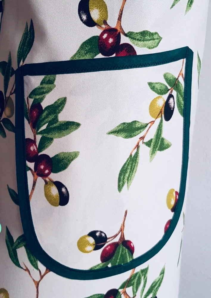 This NEW Italian Cotton Kitchen Apron features a traditional style with an olive pattern, perfect for adding a touch of Mediterranean charm to your cooking routine. Made of cotton, this one-size-fits-all chef apron is machine washable up to 100°F for easy care. This multicolored apron is crafted in Italy and ideal for use in the kitchen, making it a practical and stylish addition to your home decor.