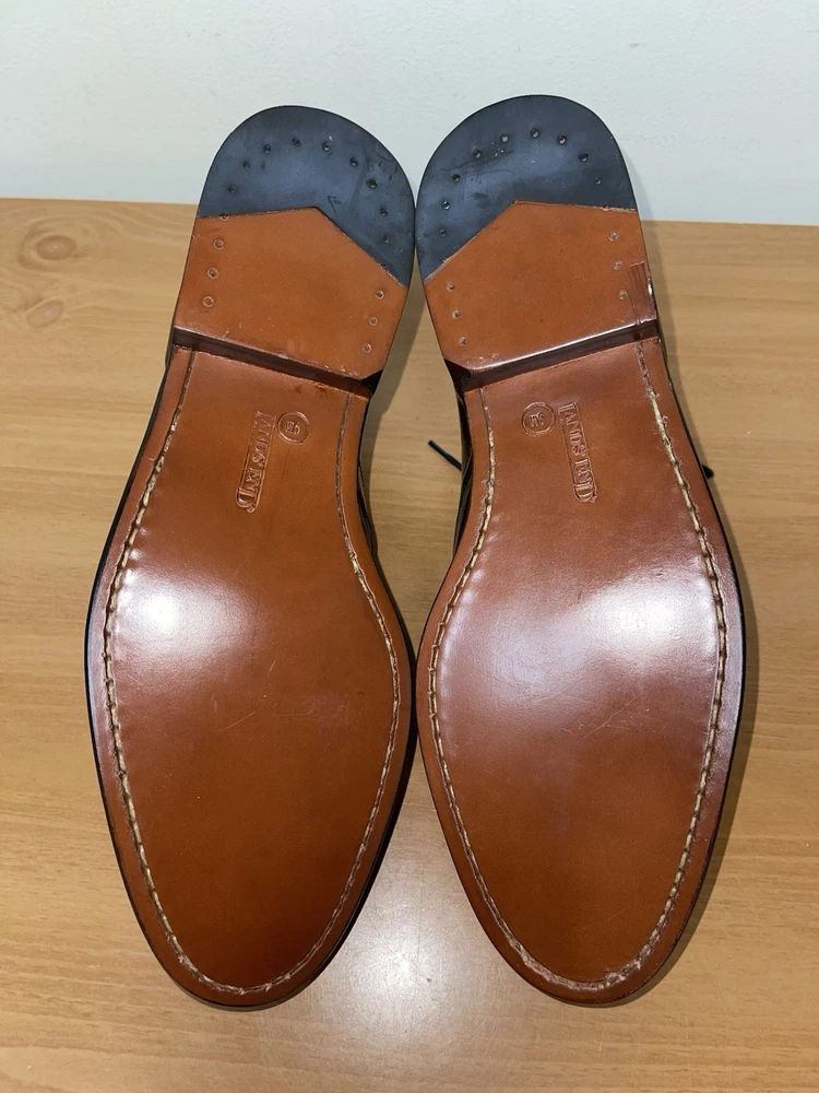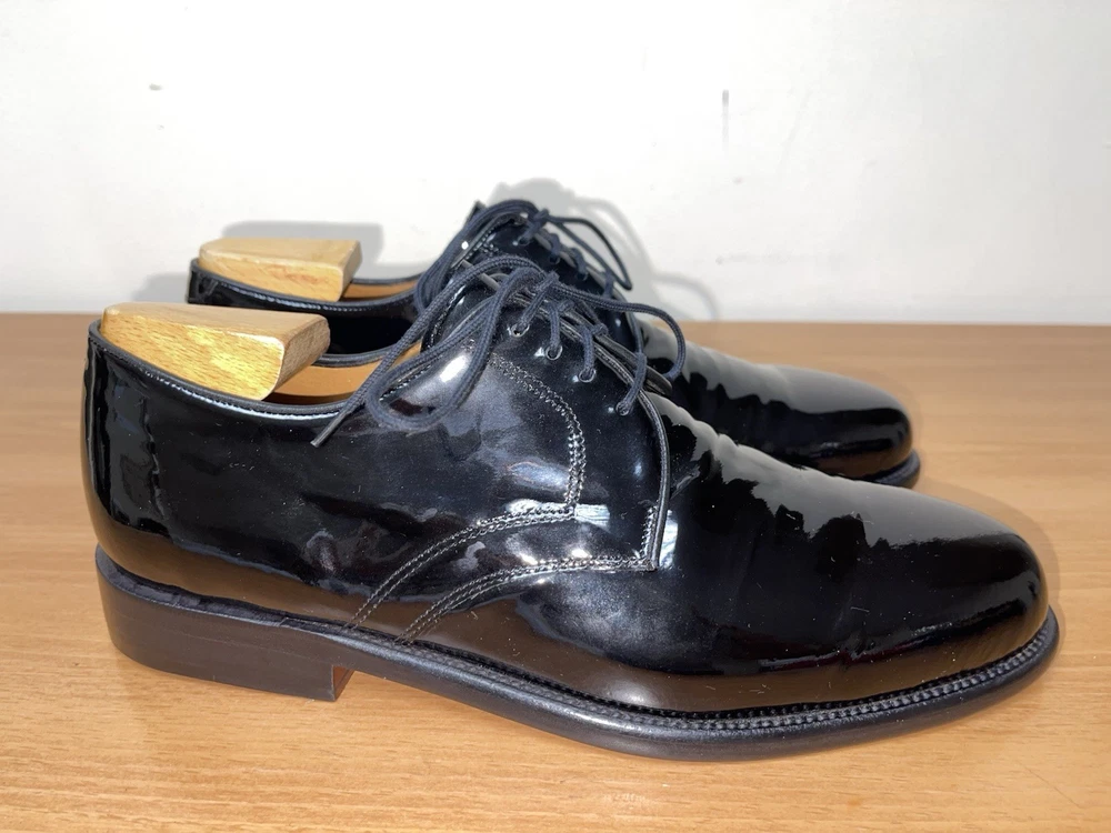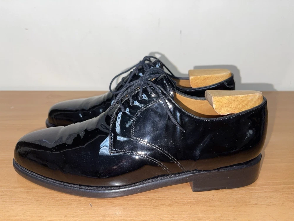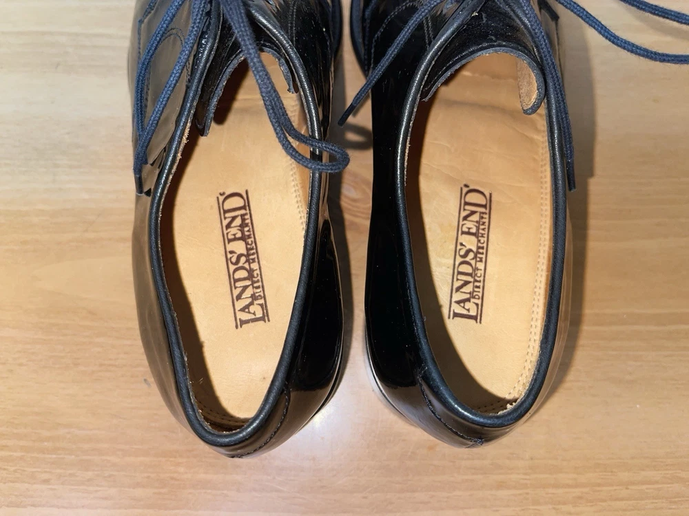 These Land's End men's black patent leather tuxedo shoes in size 9M are a stylish and comfortable choice for any formal occasion. With a classic round toe shape and lace-up closure, these Oxford-style shoes feature a solid black color and are made of high-quality leather both inside and out. Designed for comfort, these dress shoes are perfect for year-round wear and can be easily paired with a tuxedo or a dressier outfit for a sophisticated look. Made in Brazil, these shoes are a timeless addition to any man's wardrobe. New without box. Shipped with USPS ground advantage.