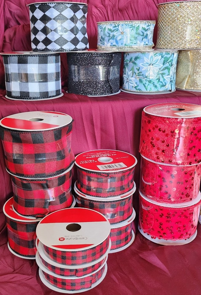 The product is a lot of 20 rolls of wire edge ribbon in various colors including red, gold, and black, as well as patterns. The ribbons are made of polyester and come in a ribbon spool format. They are all wire-edged and have a width that varies. The brand is Celebrate It and the items are custom bundled. The ribbon is from Taiwan and suitable for various crafting projects.