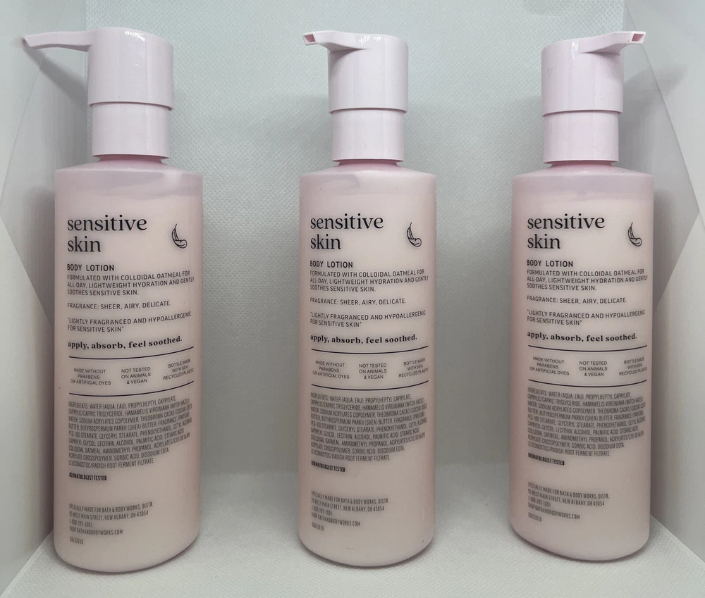 Color: Pink Skin Type: Sensitive Skin UPC: 667558227275 Department: Unisex Set Includes: Daily Use Formulation: Lotion Country/Region of Manufacture: United States Product Line: Bath & Body Works Ultra Hydration Body Lotion Fragrance Name:: Sensitive Skin Colloidal Oatmeal Size: Regular Scent: Clean, Fresh, Water Body Area: Full Body Volume: 7.8 fl oz Brand: Bath & Body Works Type: Daily Use Main Purpose: Moisturizer Features: Animal Cruelty-Free, Hydrating, Hypoallergenic, Paraben-Free gtin13: 667558227275