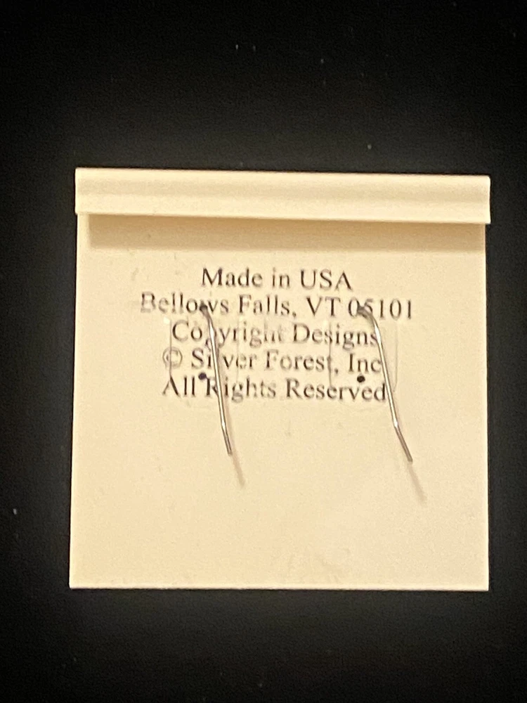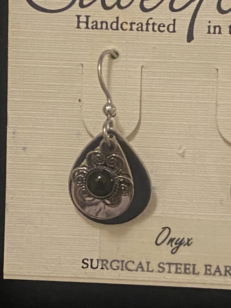 These handcrafted dangle earrings by Silver Forest are made in the USA and feature black onyx stones set in a silver tone with black color design. The earrings have a versatile style suitable for everyday wear, with a hook closure for easy wearing on the ear lobes. The onyx stones are round in shape and add a touch of elegance to the design, making them a chic addition to any jewelry collection.
