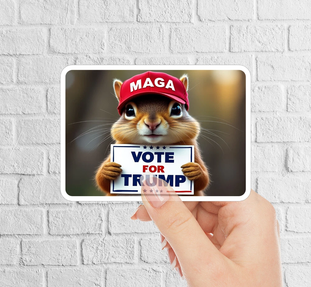 This unique sticker features an adorable squirrel proudly wearing a MAGA hat and holding a “Vote for Trump” sign. Perfect for political enthusiasts, animal lovers, and anyone with a good sense of humor, this sticker adds a playful twist to the world of political memorabilia. It’s a fun, lighthearted way to showcase your support! Crafted from high-quality vinyl with a protective laminate, this sticker is designed for vibrant indoor use on laptops, notebooks, water bottles, and more. Note: It is not weatherproof and may fade if exposed to outdoor elements. Key Features: Charming design with a pro-Trump squirrel in a MAGA hat holding a "Vote for Trump" sign Made from premium vinyl for vibrant color and durability Perfect for indoor decoration; not UV or weather-resistant Great gift for supporters, collectors, and those who appreciate whimsical designs Not suitable for extended outdoor use or UV exposure Add this adorable yet patriotic squirrel sticker to your collection, or gift it to a fellow fan!