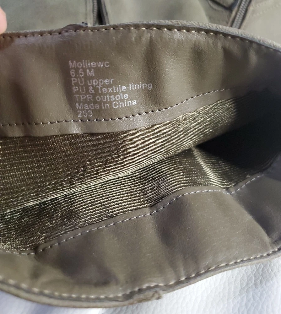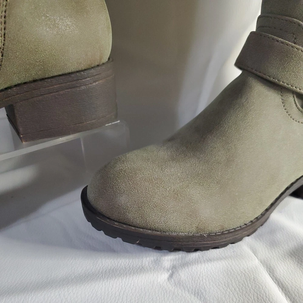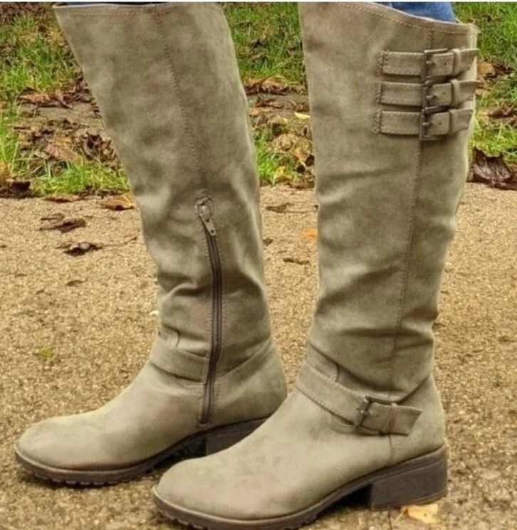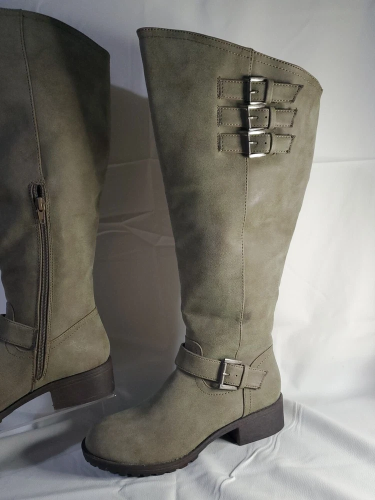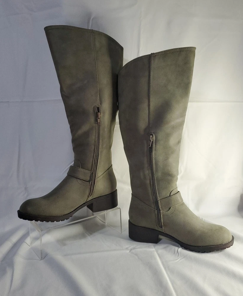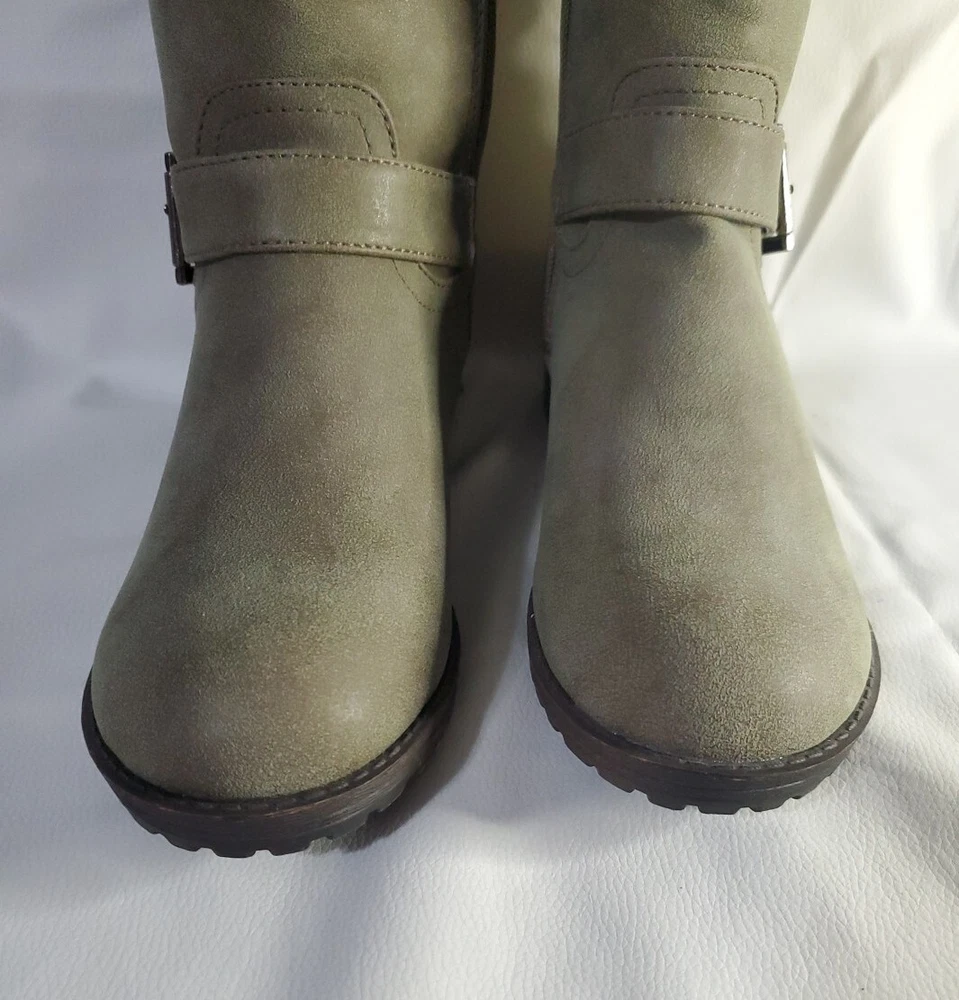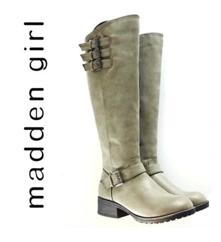 Elevate your shoe collection with these gorgeous Madden Girl Mollie Riding Tall Boots in Stone. The boots feature a stunning Almond Toe shape, Buckle Closure and low (1-1.9 in) Block Heel Style. The Stone color and Solid Pattern make them perfect for any occasion, from party to business. These beautiful boots are made with Manmade Lining Material, Suede Upper Material, and Synthetic Insole Material. Their ankle-length Shoe Shaft Style and Calf Width (Wide) make them comfortable to wear for long hours. The boots come in US Shoe Size 6.5 and have a theme of Tall boots. These boots are perfect for any woman who wants to make a statement with her shoes. Brand new w/out box - Madden Girl Mollie Riding Boot The Mollie knee-high riding boot has the perfect touch of versatile charm and street style biker-chic. These boots have a round-toe design and buckle accents, for a simple and classic look. Lug sole with block heel. Fabric Type: 100% Synthetic Sole Material: Thermoplastic Elastomers Color: Stone Approximate measurements: Shaft Height: 17.25” Heel: 1.75” Platform: 0.5” Size: 6.5 *Wide Calf Retail Price $89