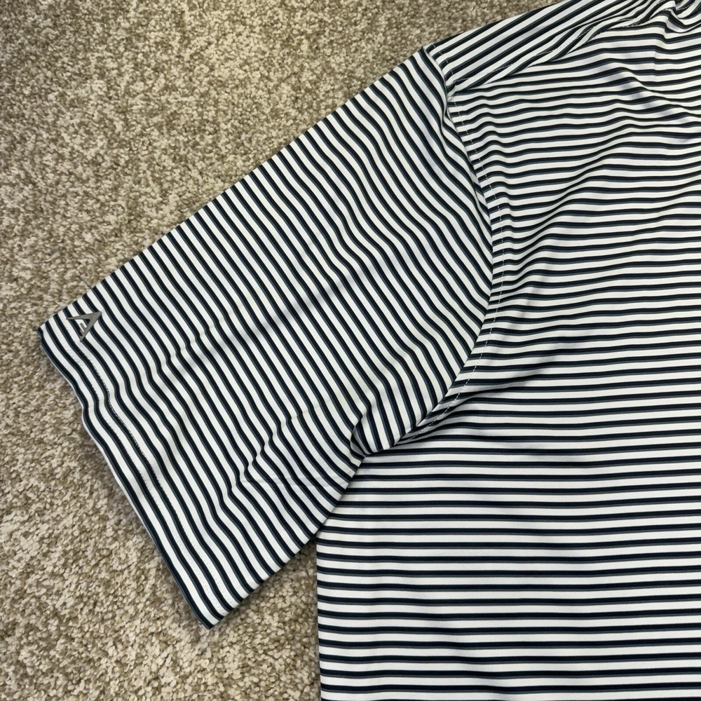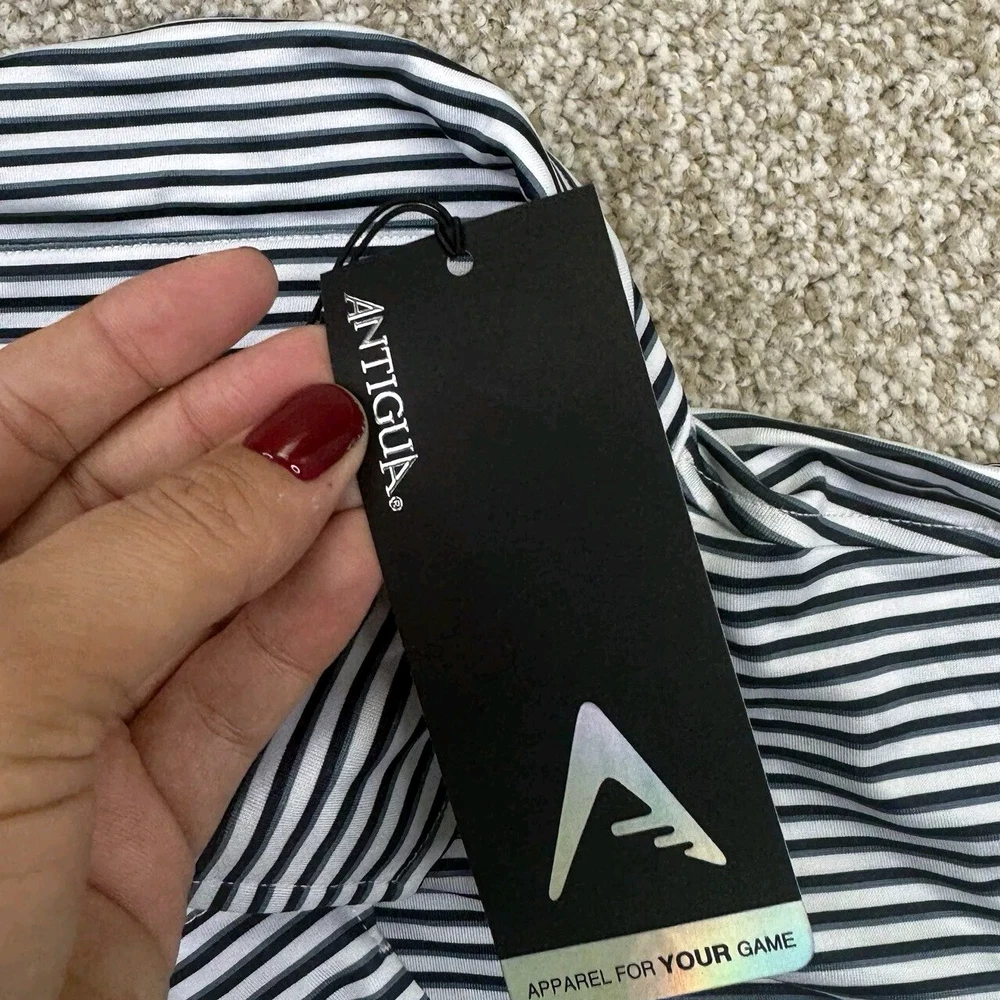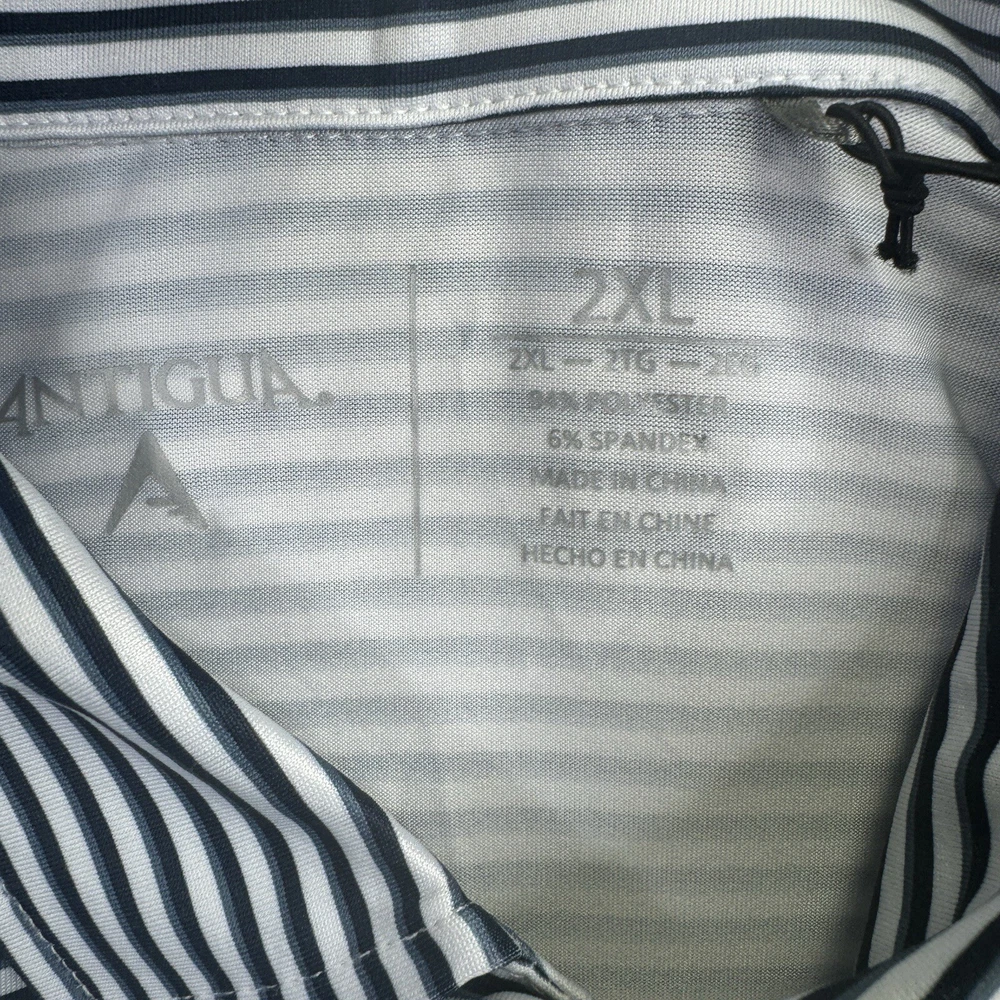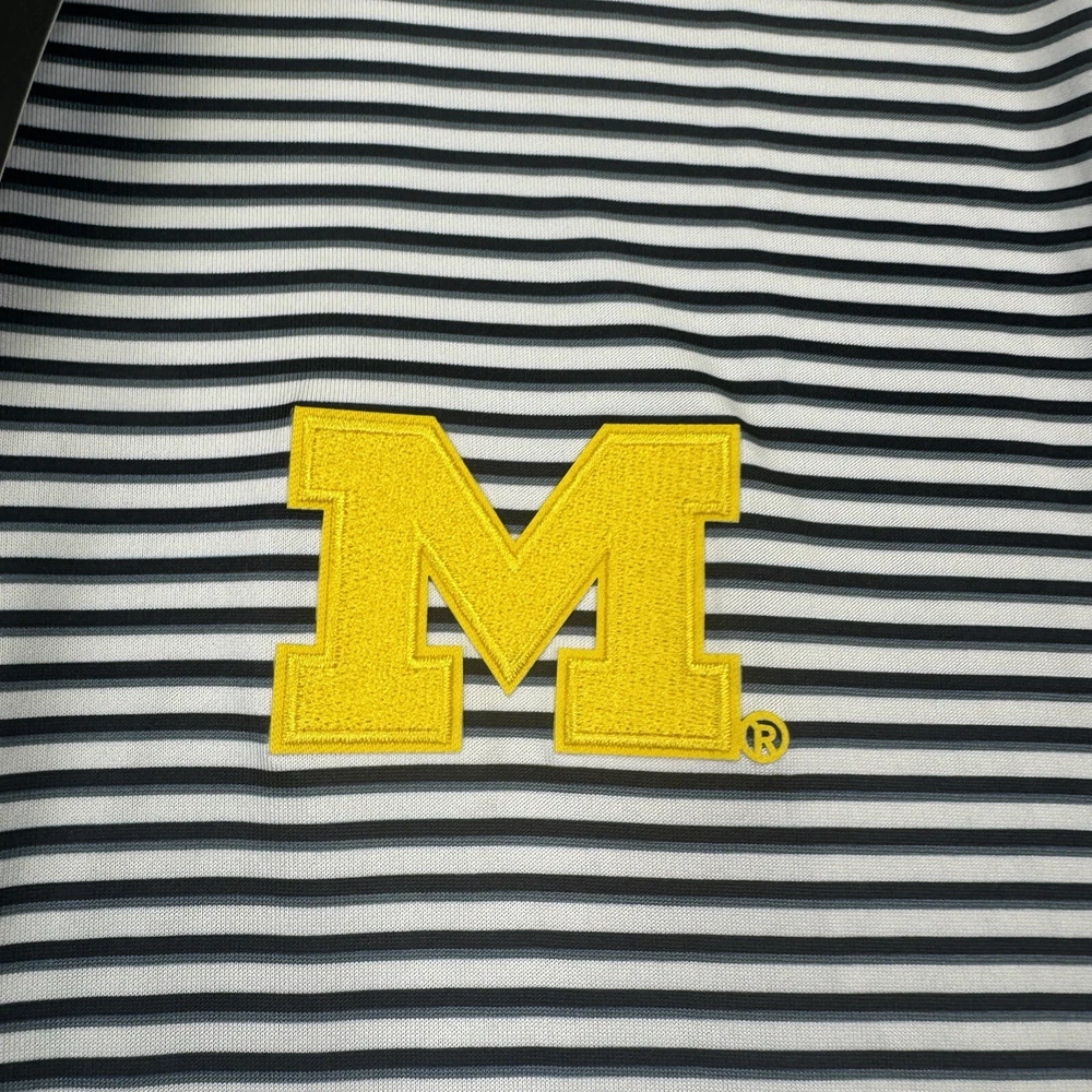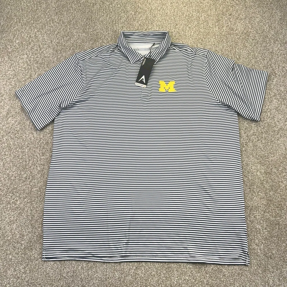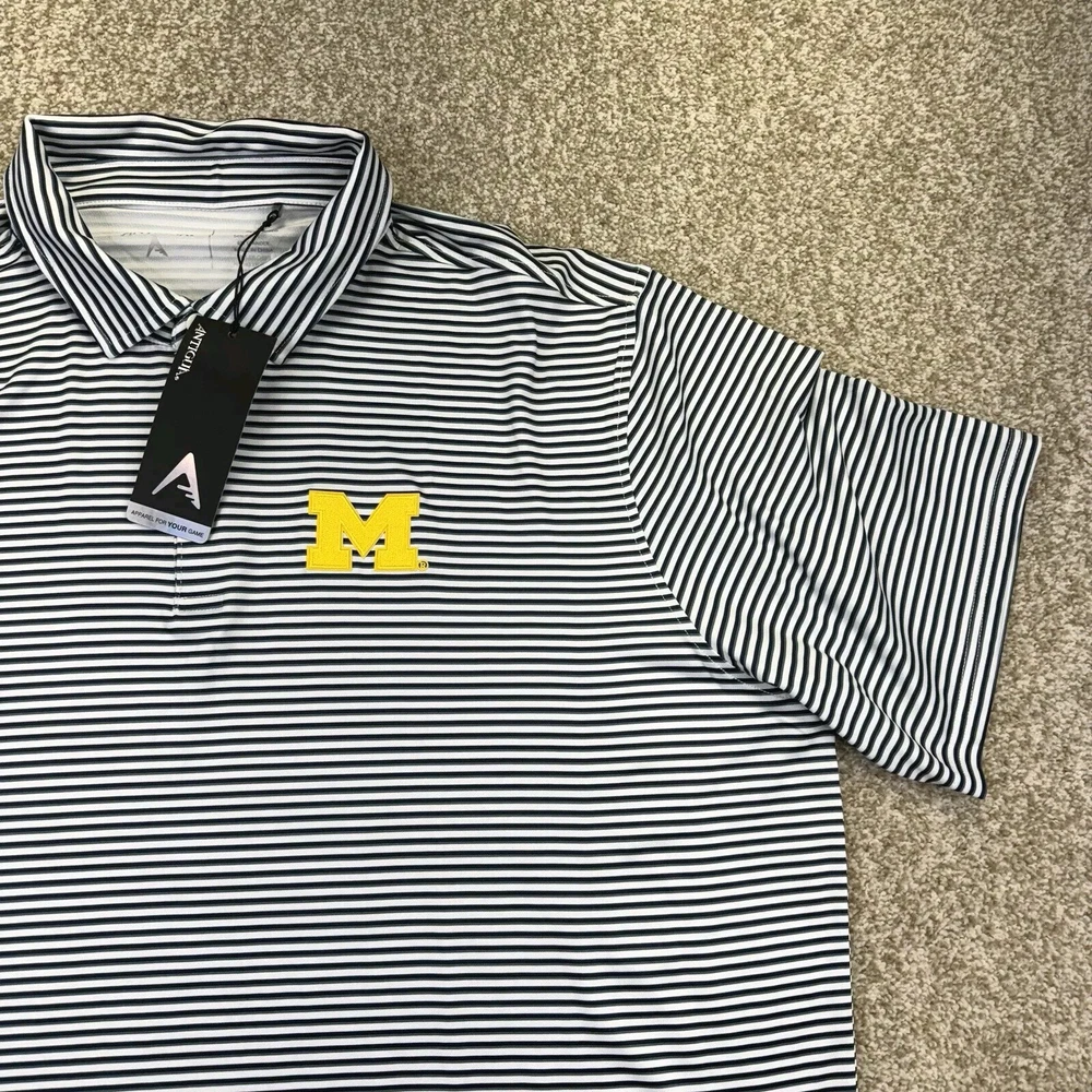 NWT Michigan Wolverines Polo Shirt Mens 2XL White Blue Stripes Short Sleeve Antigua. Condition Is New With Tags. Shipped Standard. See Photos With Measurements.