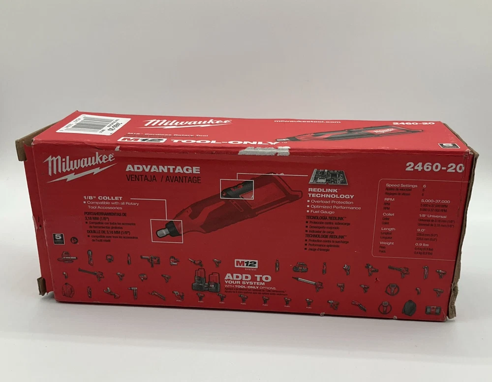 NEW! Box has been opened for inspection and photos. Brand new! Milwaukee Lithium-Ion M12 Cordless Rotary Tool- TOOL ONLY Model Number: 2460-20 Tool only! No battery! About Us Customer service is our #1 priority! If for any reason you are dissatisfied with your purchase we offer a 30 day money back guarantee unless otherwise noted in the listing (AS-IS/For Parts - No returns.) We only accept items back in the condition that they were sent to you. Items that are listed AS-IS are not eligible for this money back guarantee. If you are unhappy with your purchase PLEASE contact us BEFORE leaving feedback or contacting eBay so we can work with you to resolve any problems. Shipping When we charge shipping to our customers we only pass on to our buyers exact shipping costs - no added fees. We offer combined shipping for multiple items purchased, so if you purchase more than 1 item from us, please wait for us to combine shipping costs. We require signature confirmation on all items that sell for $750.00 & more per eBay's selling policy. We also insurance all items that sell for $250.00 & more. PLEASE NOTE: WE DO NOT WORK/SHIP ON HOLIDAYS OR WEEKENDS! We use the eBay Global Shipping program for international shipping. DLLR License #991 Please note, we are not an authorized distributor or manufacture's representative of this item. *This product may contain a chemical known to the state of California to cause cancer and birth defects or other reproductive harm*