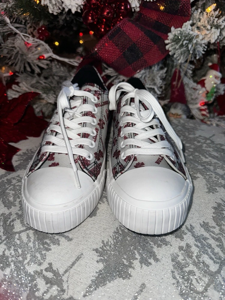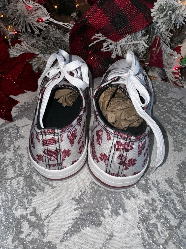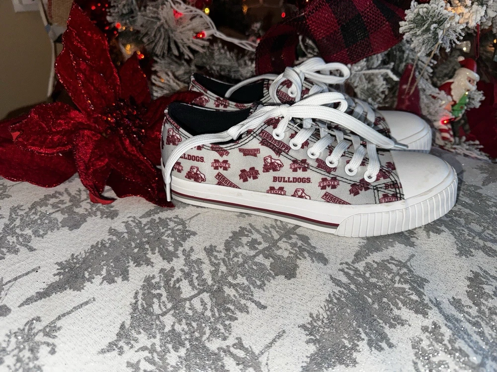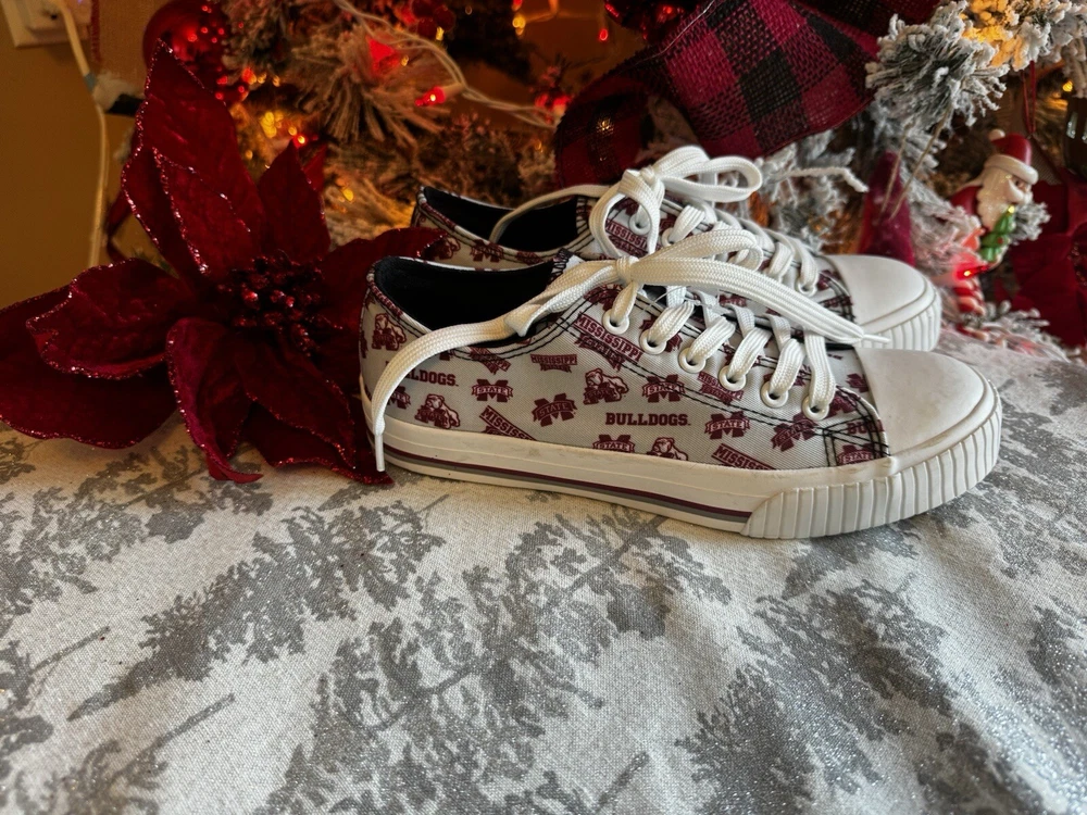 NEW! Mississippi State Bulldogs Womens Low Top Repeat Print Canvas Shoe Sz 8 Slip-on style with closed, round toe design to protect your fan feet from the elements White laces so you can lace up Black insole Details Material: Upper - Textile / Sole - Rubber Printed graphics Officially licensed Imported