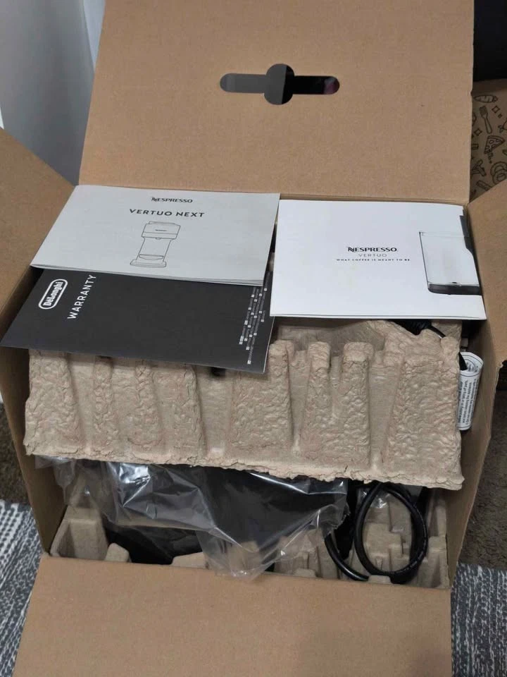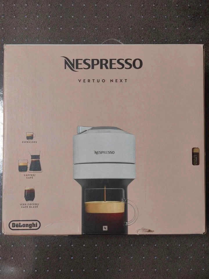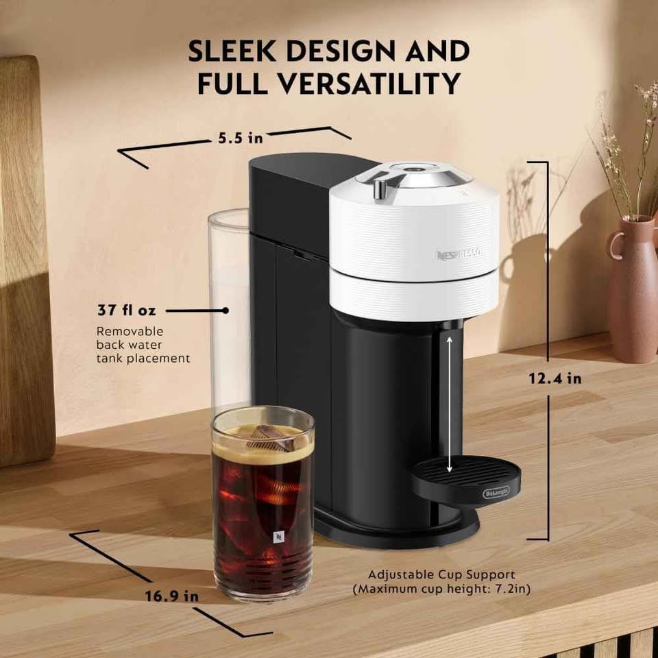 Brew any coffee in six different sizes with the Vertuo Next. This model brews all coffee sizes from the smallest espresso to our biggest carafe size. Its slim design even caters to our taller mugs, making room for our 7” travel mugs. The Nespresso Vertuo Next Deluxe Coffee and Espresso Machine in Chrome offers a high-quality coffee experience with its 19-bar pressure system for rich and flavorful beverages. With a 1.2 qt water tank capacity and the ability to brew both espresso and coffee using Nespresso capsules, this machine is convenient and easy to use. The sleek chrome design adds a stylish touch to any kitchen, while features like auto shut-off and a compact size make it practical for both home and office use. This Nespresso Vertuo model is perfect for coffee lovers looking for quick and delicious brewing options. For only $51.95 OBO. Retails for $179 NEW OPEN BOX! MACHINE ONLY - NO FROTHER INCLUDED Check out my other listing too! :)