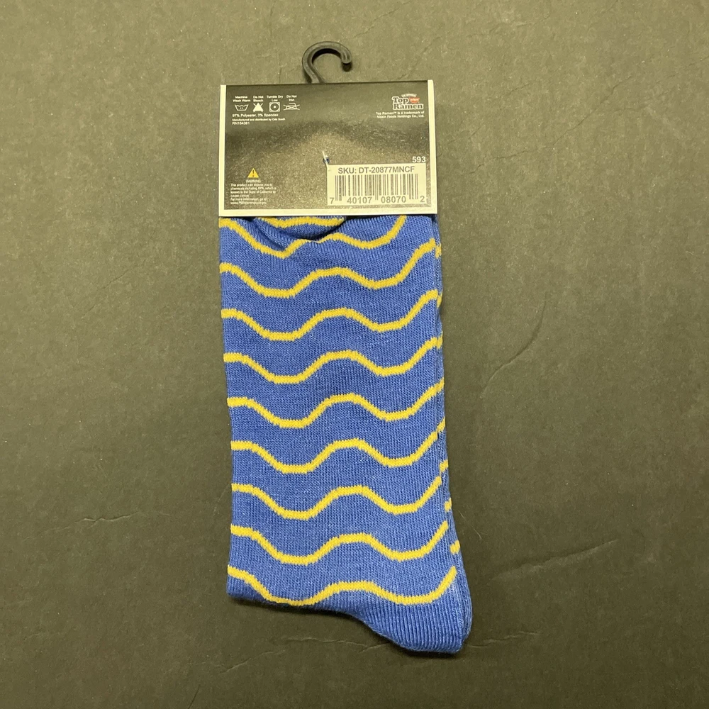 Add some fun to your sock collection with these Nissin Top Ramen Soy Sauce Socks. These unisex crew socks feature a solid blue background with many yellow squiggly lines and the Top Ramen logo, making them perfect for any foodie. The mid-calf length and full toe style provide a comfortable fit for walking and other activities. Made from a blend of polyester and spandex, these socks are lightweight and breathable, ensuring your feet stay fresh throughout the day. With a pack of one pair, these socks are perfect for anyone looking for a unique and comfortable addition to their wardrobe. Whether you're a fan of Top Ramen or just love novelty socks, these Nissin Top Ramen Soy Sauce Socks are a must-have.
