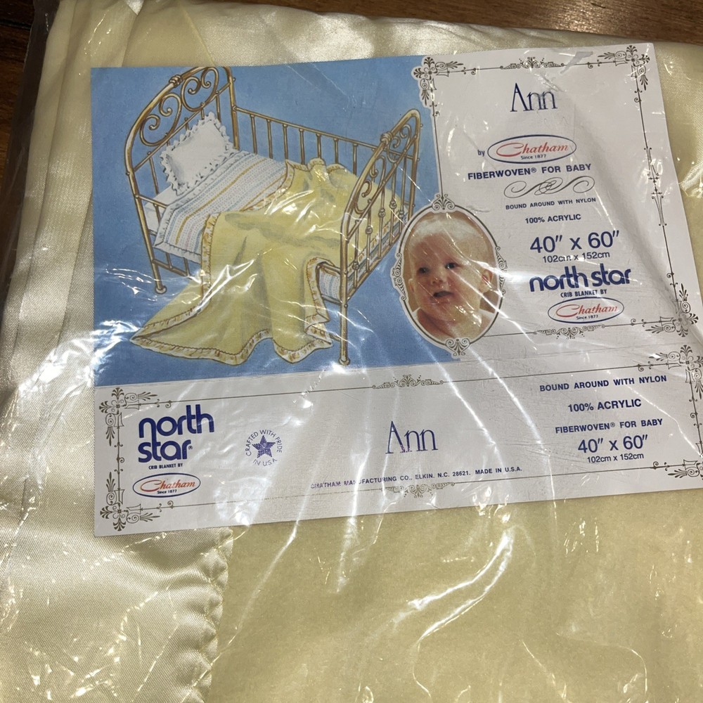 The NEW Northstar Chatham Vintage Baby Blanket is a yellow acrylic crib blanket measuring 40” x 60”, perfect for a baby's nursery. This unisex baby blanket features easy care and breathable material, making it comfortable and convenient for parents and their little one. Made by the brand Chatham in the United States, this sealed baby blanket with a baby theme is a cozy addition to any baby's room.