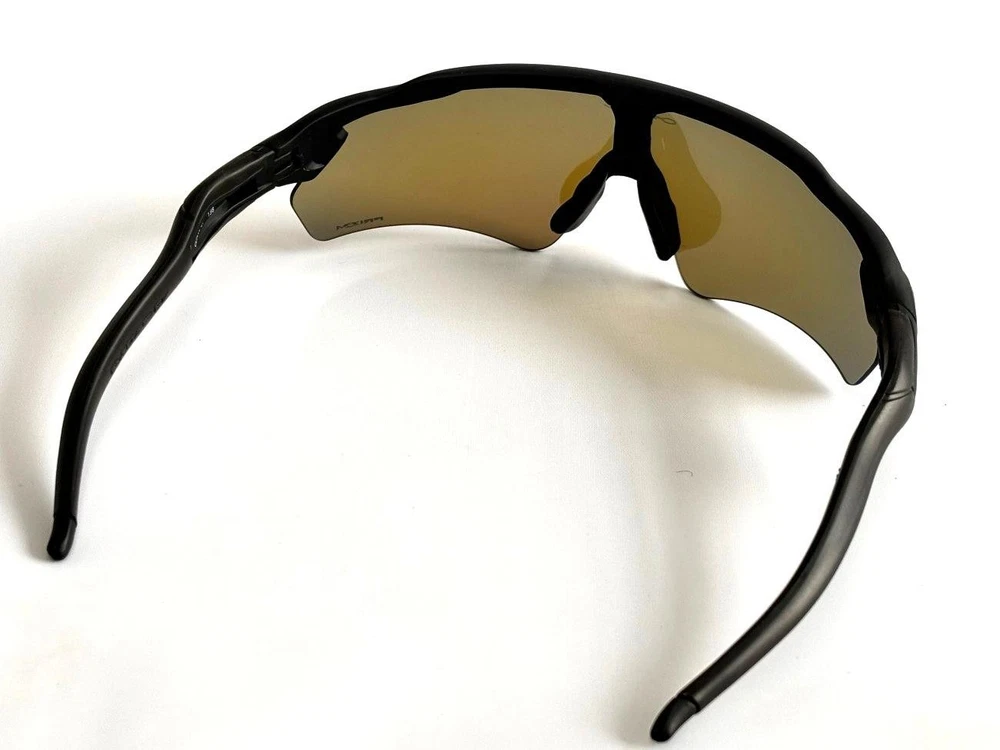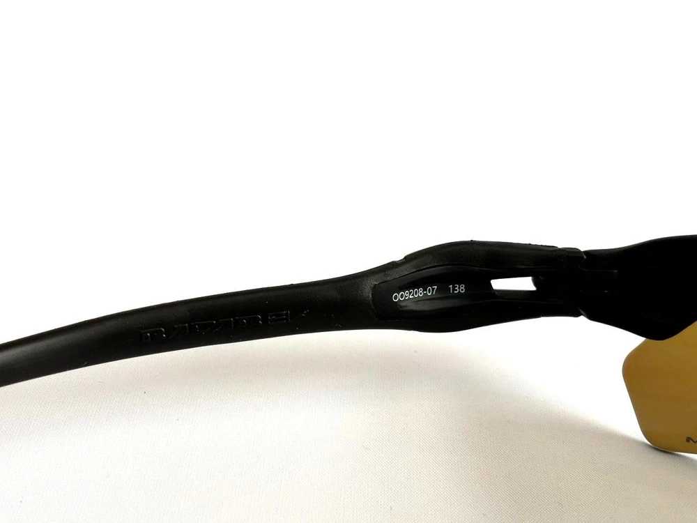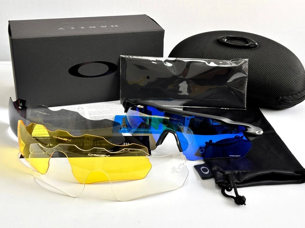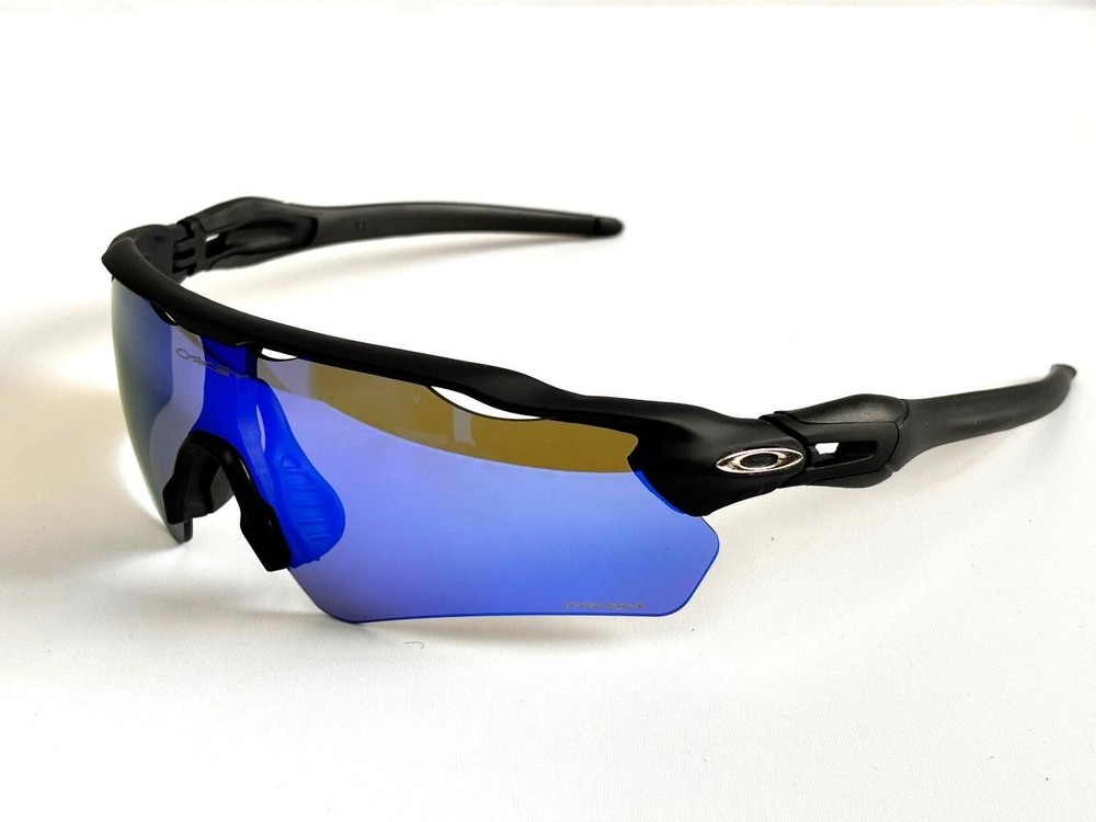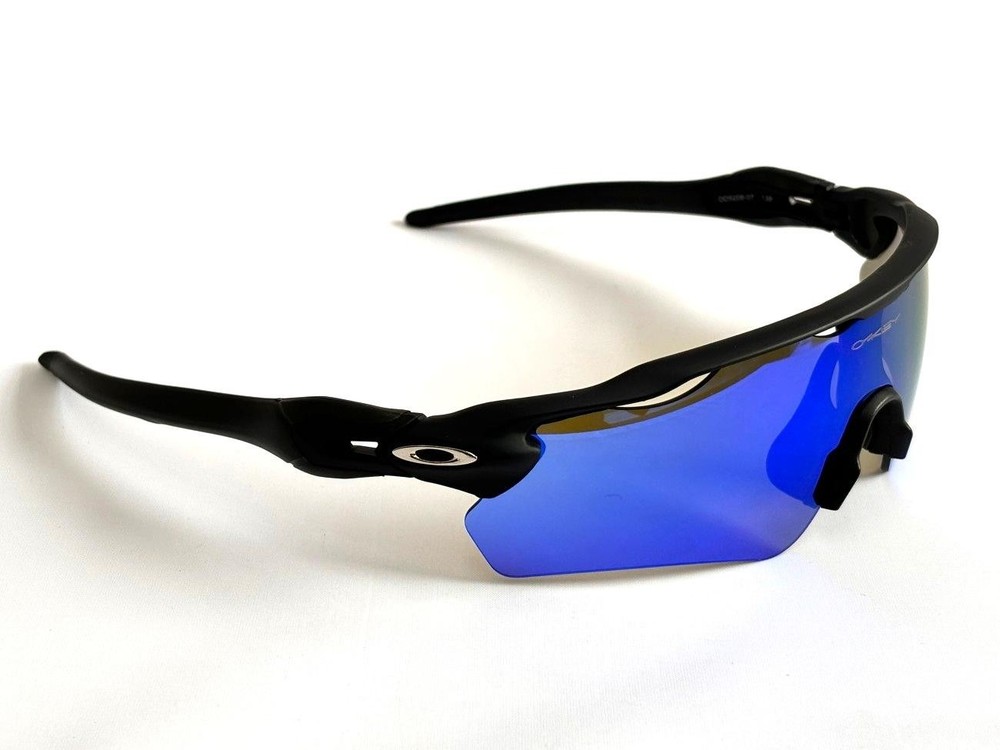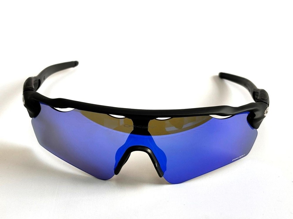 NEW Oakley Radar EV Patn Sunglasses Black Frame Blue Prizm Lenses OO9208 This listing includes a pair of Oakley sunglasses, Oakley zip case, Oakley 3 replacement lenses Oakley microfibre pouch and Oakley paperwork. No scratches New nose pad Temple length - 128mm Frame color - Black Lens color - Prizm Blue