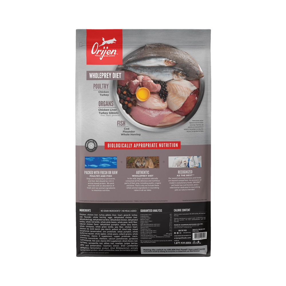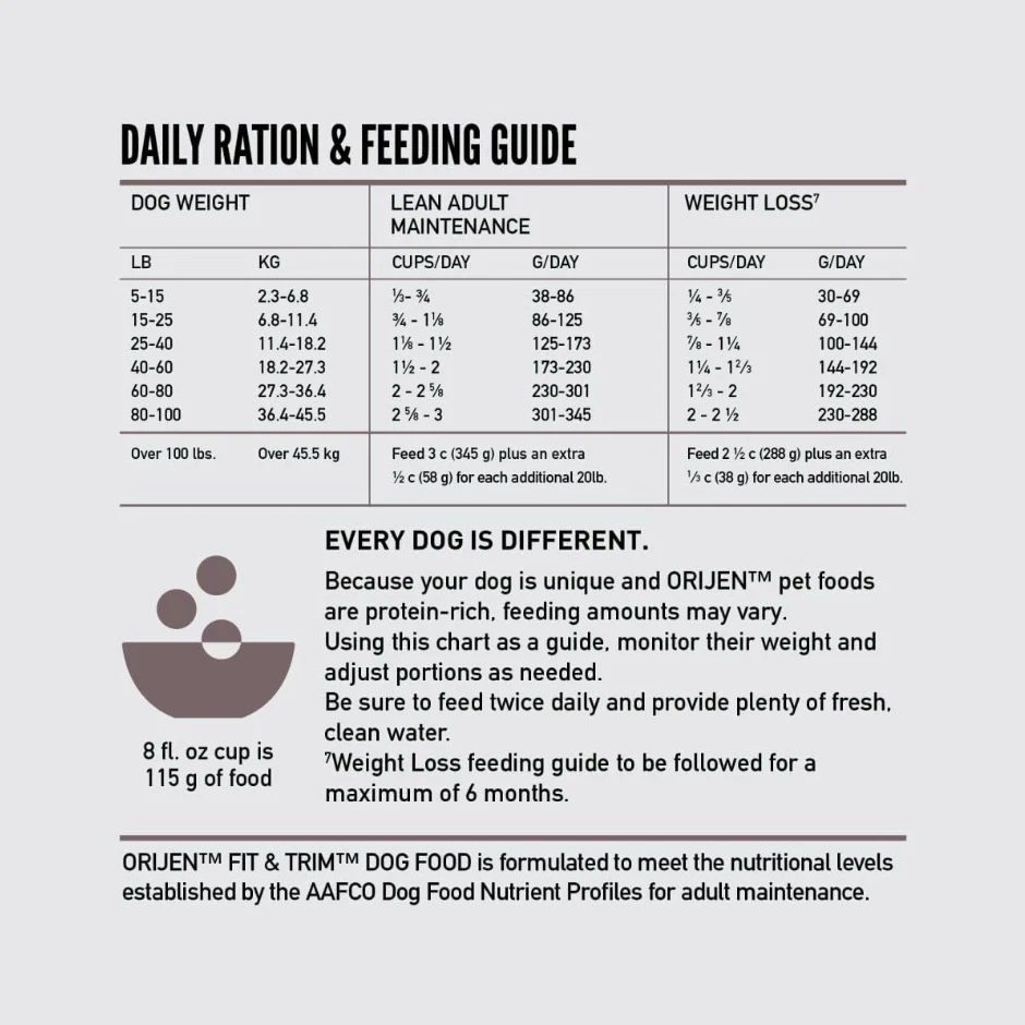 DESCRIPTION Has your dog got a few extra pounds on them? Try giving them Orijen's Fit and Trim Dog Food. Overweight dogs need high protein levels to build muscle and exercise. They also need limited carbohydrates so they start digesting fats instead of storing them. Help your pup get in shape with a healthy diet and regular walks so they can live a long and happy life as your best friend. They'll thank you later! A diet rich in protein and fibre supports lean muscle mass while promoting peak conditioning and a healthy body weight. ORIJEN Fit & Trim has richly nourishing protein and 85% whole animal ingredients from free-run chicken and turkey, wild-caught fish, and cage-free eggs, all delivered to our kitchen. Two-thirds of our animal ingredients are FRESH or RAW, for a concentrated source of protein. Infusions of freeze-dried liver add a boost of flavour that your dog will love, while naturally providing the nutrients they require to help them stay happy, healthy, and thriving. Orijen Fit & Trim Dog is formulated to meet the nutritional levels established by FEDIAF for Adult Maintenance. Metabolizable Energy is 3530 kcal/kg (425 kcal per 250ml/120g cup) with calories distributed to support peak conditioning; 48% from protein, 19% from vegetables and fruits, and 33% from fat. Product Details Protein Chicken, Turkey Brand Orijen Species Dog Packaging Bag Breed Size All Breeds Food Criteria Dry Food Special Diet Potato-Free, No Corn, Wheat, or Soy, Grain-Free, Weight Control, High Protein Life Stage Adult Holidays New Year's ⚠️ IMPORTANT – PLEASE CONTACT ME FIRST If you experience any issue (tracking delays, missing or damaged items, incorrect order, etc.), please message me before opening a case. I respond very quickly (usually within 1–2 hours) and I’m always happy to help resolve any problem. Opening a case may slow down the resolution for both of us. Thank you for your understanding!