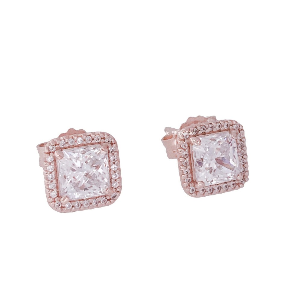 DESCRIPTION: STYLE: Pave square sparkle halo stud earring COLOR: rose gold SIZE: One size CONDITION: brand new in retail condition. DETAILS: Pandora Rose 14k gold plated sterling silver with, hand-finished.