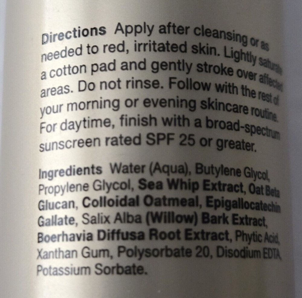 NEW Paulas Choice Clinical Instant Calm Advanced Redness Relief DISCONTINUED colloidal oatmeal, sea whip extract, boerhavia difusa rool extraxt, oat beta-glucan, salix alba extract ingredients for Paula's Choice Clinical Instant Calm Advanced Redness Relief Water, Butylene Glycol, Propylene Glycol, Sea Whip Extract, Oat Beta Glucan, Colloidal Oatmeal, Epigallocatechin Gallate, Salix Alba (Willow) Bark Extract, Boerhavia Diffusa Root Extract, Phytic Acid, Xanthan Gum, Polysorbate 20, Potassium Sorbate, Disodium EDTA.
