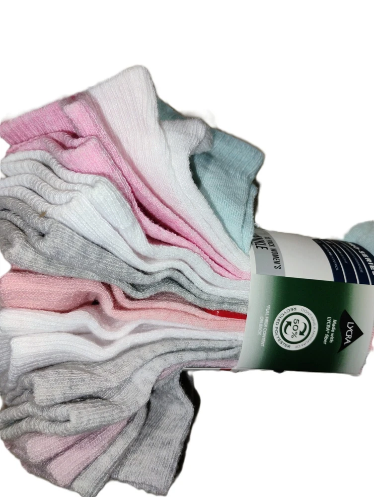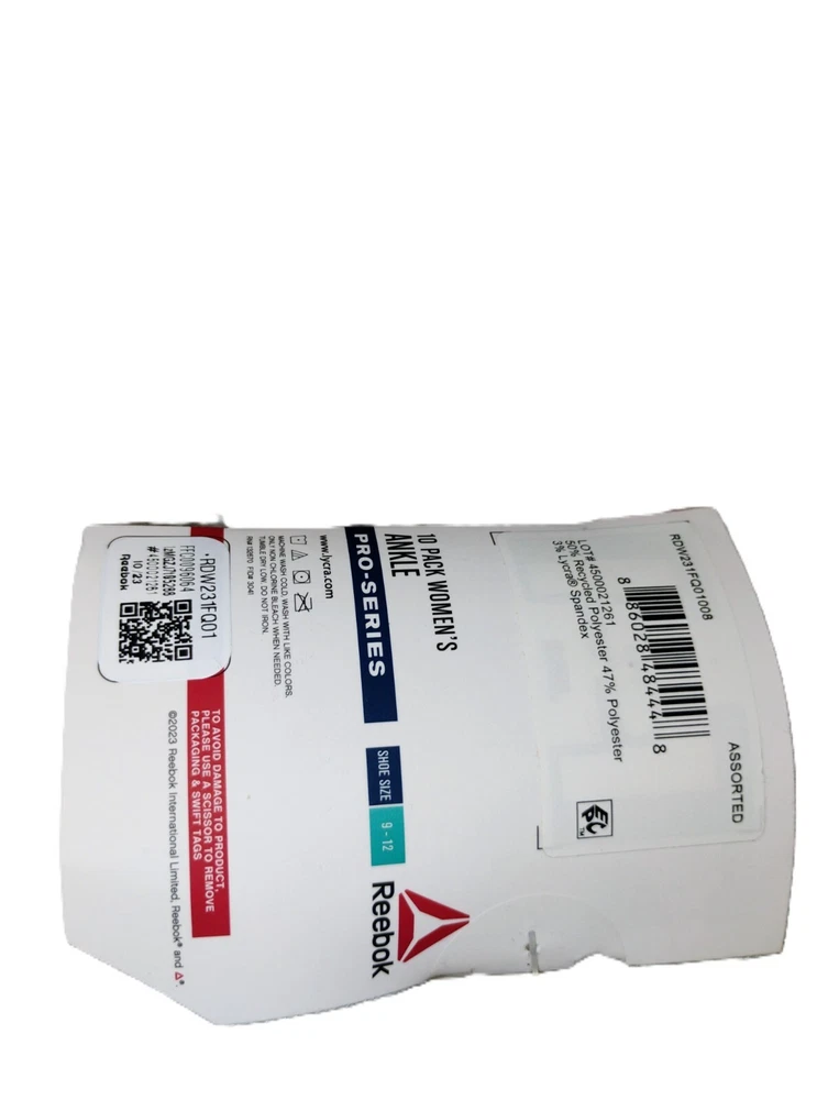 These are Reebok Pro-Series Ankle Socks in extended size 9-12, featuring a pack of 10 pairs in pink, gray, and white colors. The socks are made of Lycra, polyester, and spandex, with cushioned and moisture-wicking features. Designed for women, they have a low-cut style with full toes, suitable for activewear and everyday use. Ideal for sports activities like gym training, cross training, and CrossFit, these breathable socks are machine washable and suitable for all seasons.
