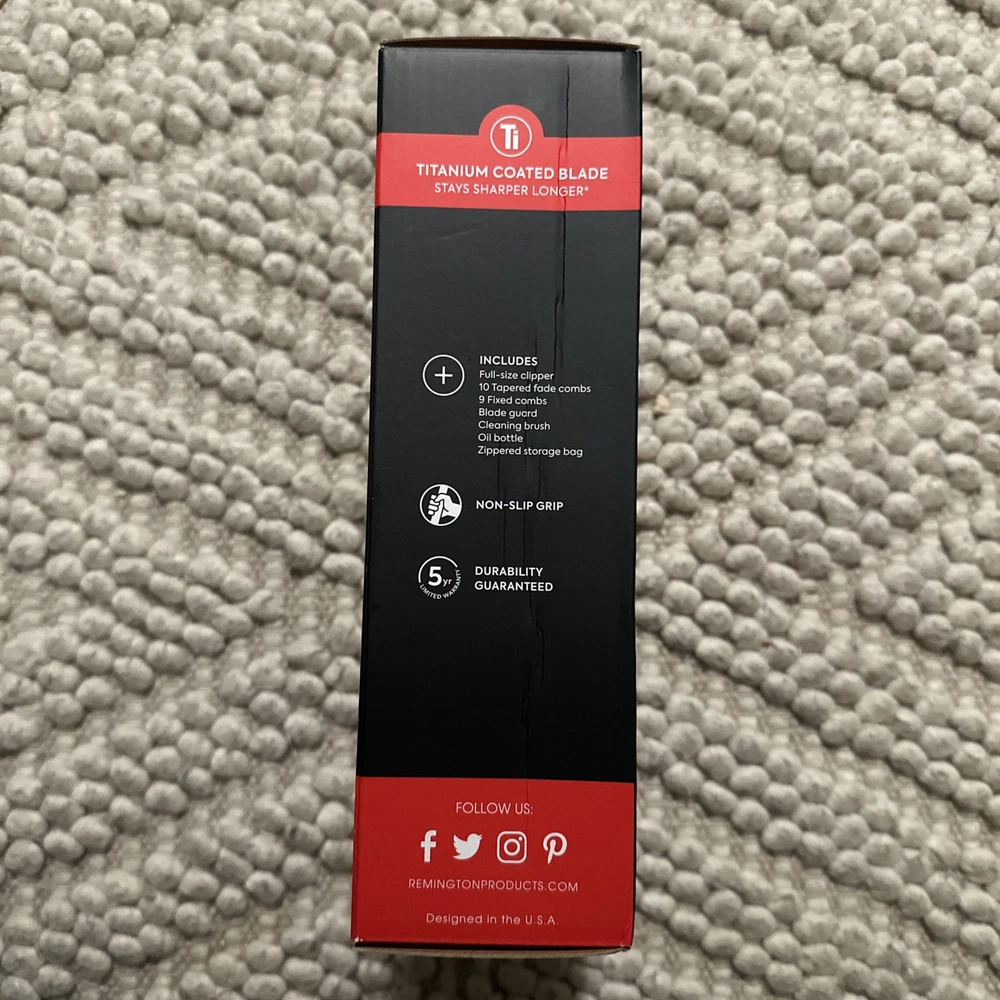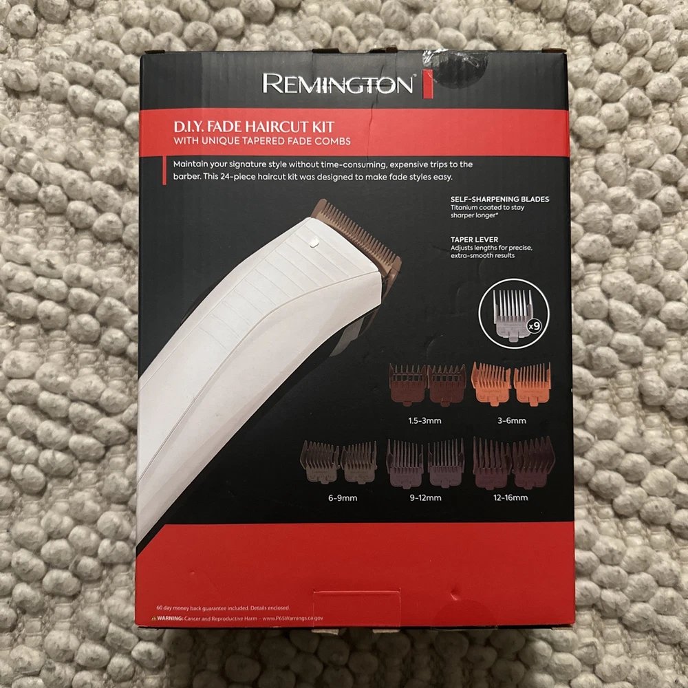 The *NEW* Remington D.I.Y Fade Haircut Kit is a men's grooming tool designed for face and body hair trimming. It is a battery-powered body trimmer with a sleek black design and a unique tapered comb for creating fades. The kit includes a rechargeable body trimmer with a cutting length of 0.9 mm, making it suitable for precise grooming. This Remington model, HC4061, is equipped with one head and is ideal for achieving professional-looking fades at home.