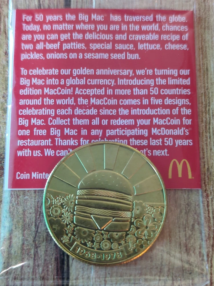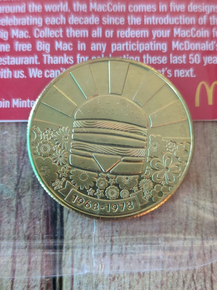 This is a brand new and sealed McDonald's 50 Years Of Big Mac Collectors Coin, celebrating the years 1968-1978. The coin is in gold color and features the iconic Big Mac burger on one side. It is an original piece of advertising, perfect for collectors of McDonald's memorabilia.